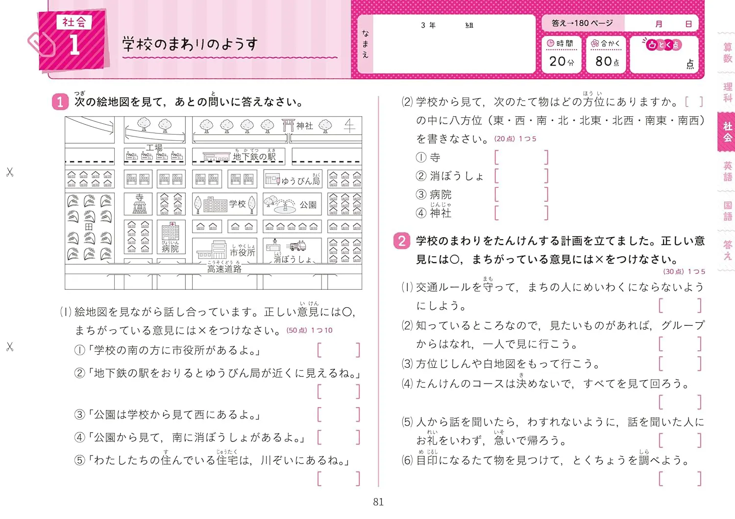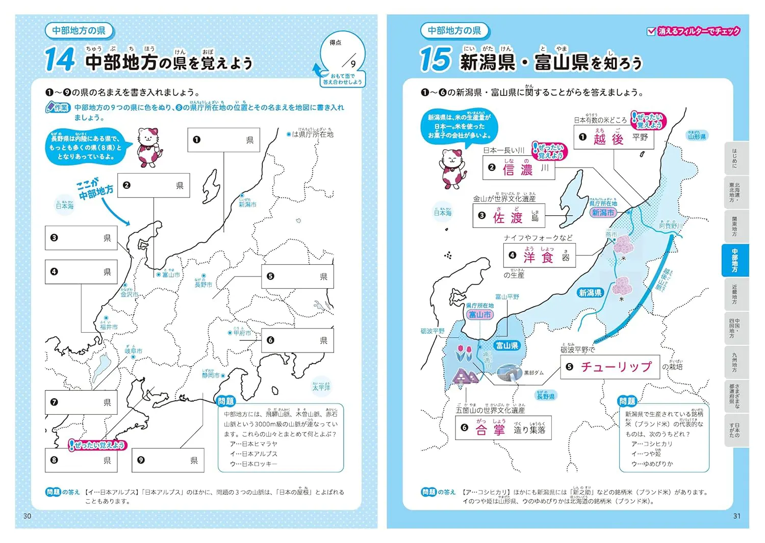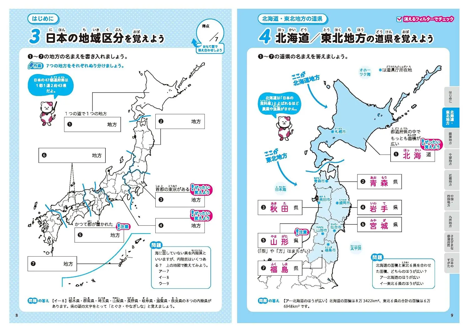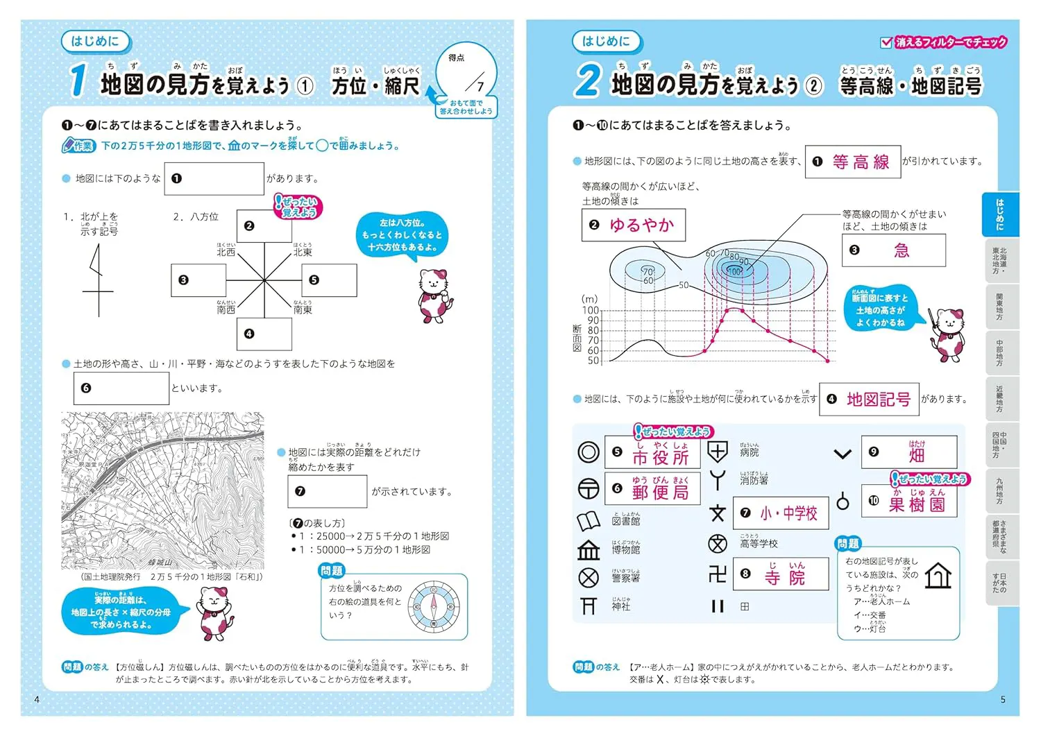 小学3・4年生が学習する都道府県の基本から、日本の国土の様子までマスターできます。地理の土台が固められるので、中学入試に向けて基礎力をつけたい人にもオススメ。「消えるフィルター」と「書きこみ問題」のくり返し学習でしっかり知識を身につけられるのがポイントです。