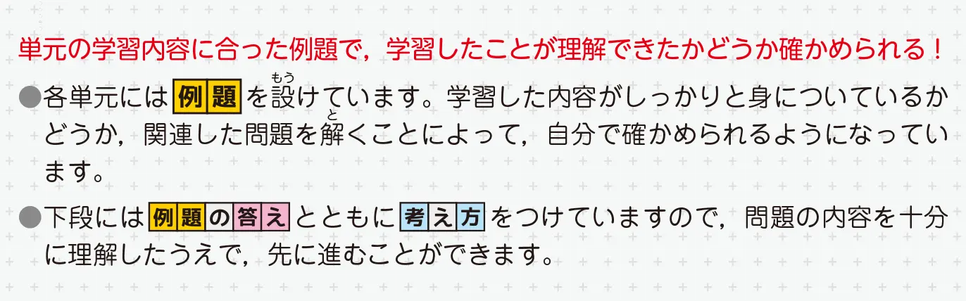 ⑤単元の学習内容に合った例題で、学習したことが理解できたかどうか確かめることができます。