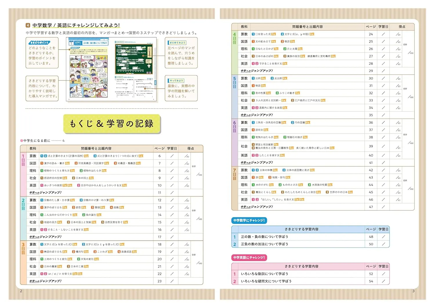 さらに中学の学習につながるコラムや、苦手になる人が多い「数学」「英語」はさきどりコーナーも用意していますので、中学の勉強をスムーズに始められるようになります。
