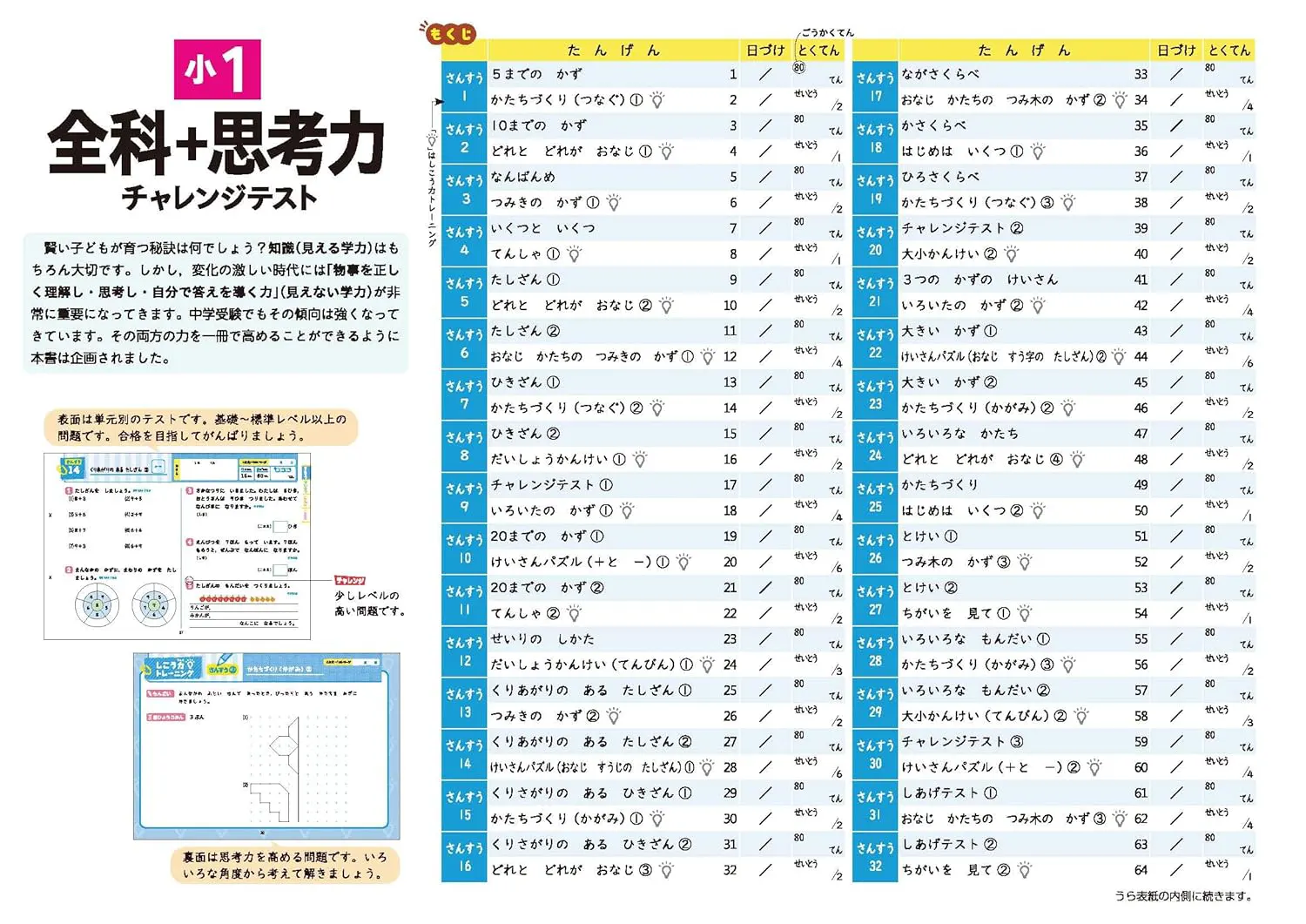 ◆「小1 チャレンジテスト 全科+思考力」は、表ページがテスト問題、裏ページが「思考力トレーニング」になったドリルです。