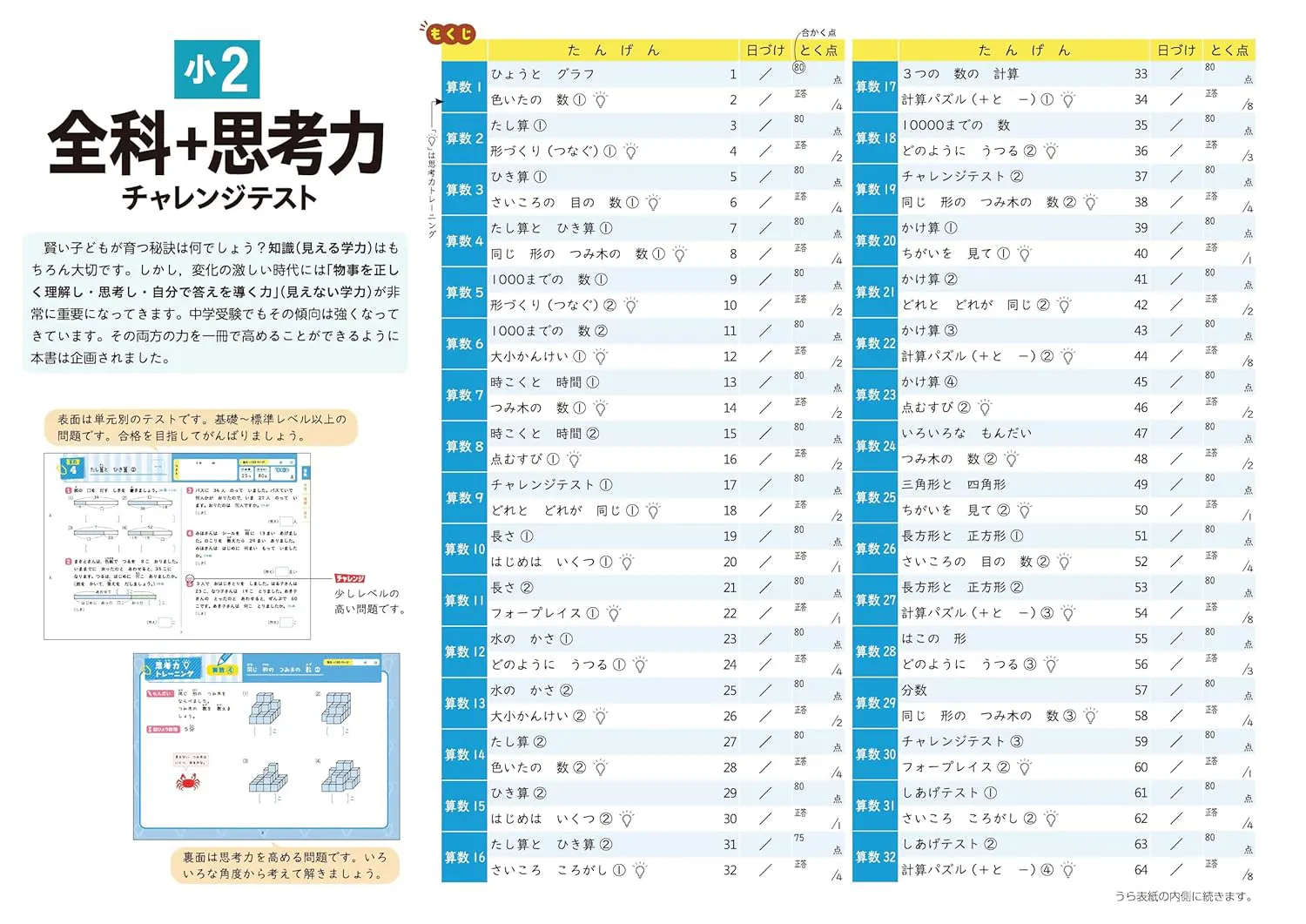 ◆「小2 チャレンジテスト 全科+思考力」は、表ページがテスト問題、裏ページが「思考力トレーニング」になったドリルです。