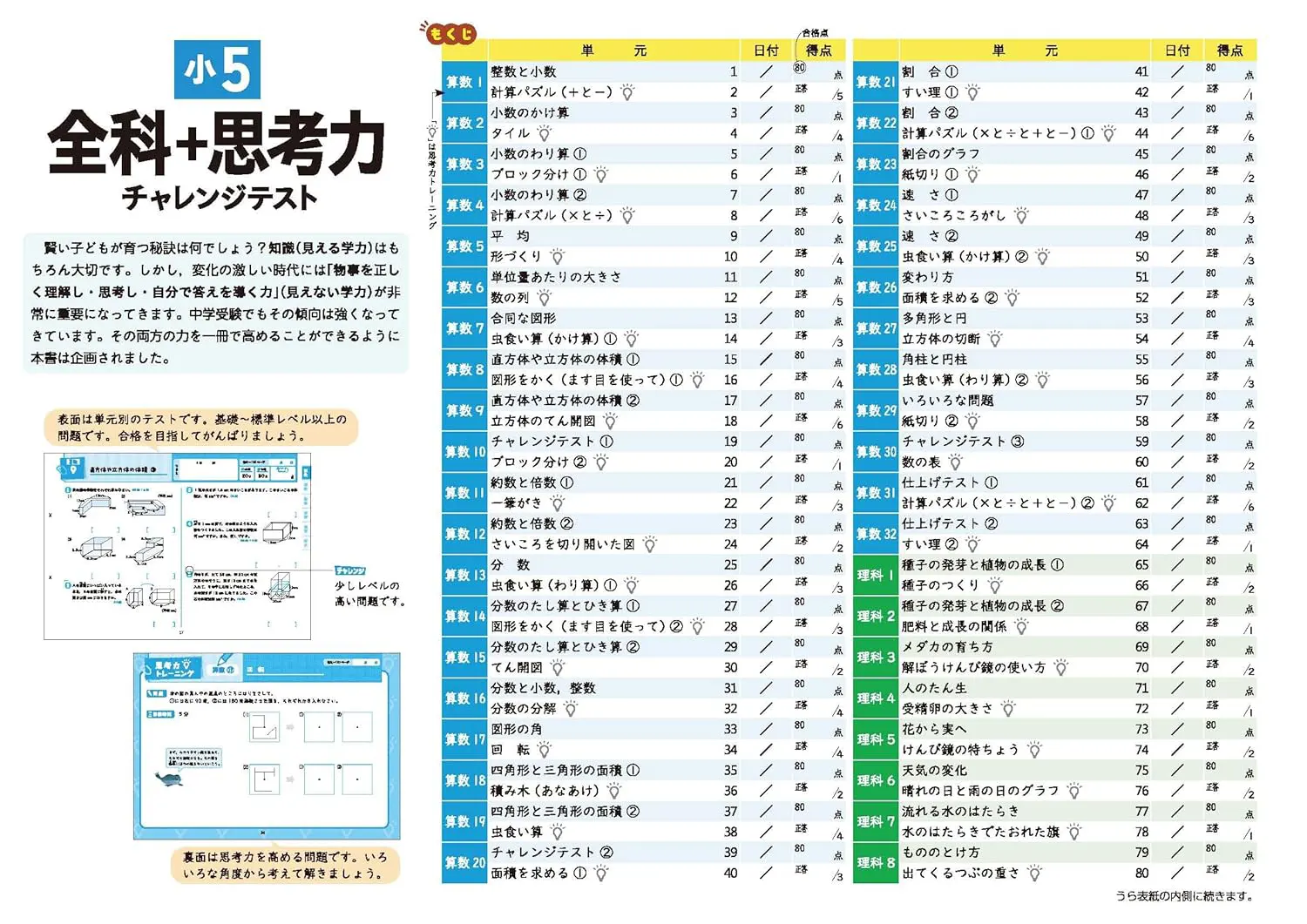 ◆「小5 チャレンジテスト 全科+思考力」は、表ページがテスト問題、裏ページが「思考力トレーニング」になったドリルです。