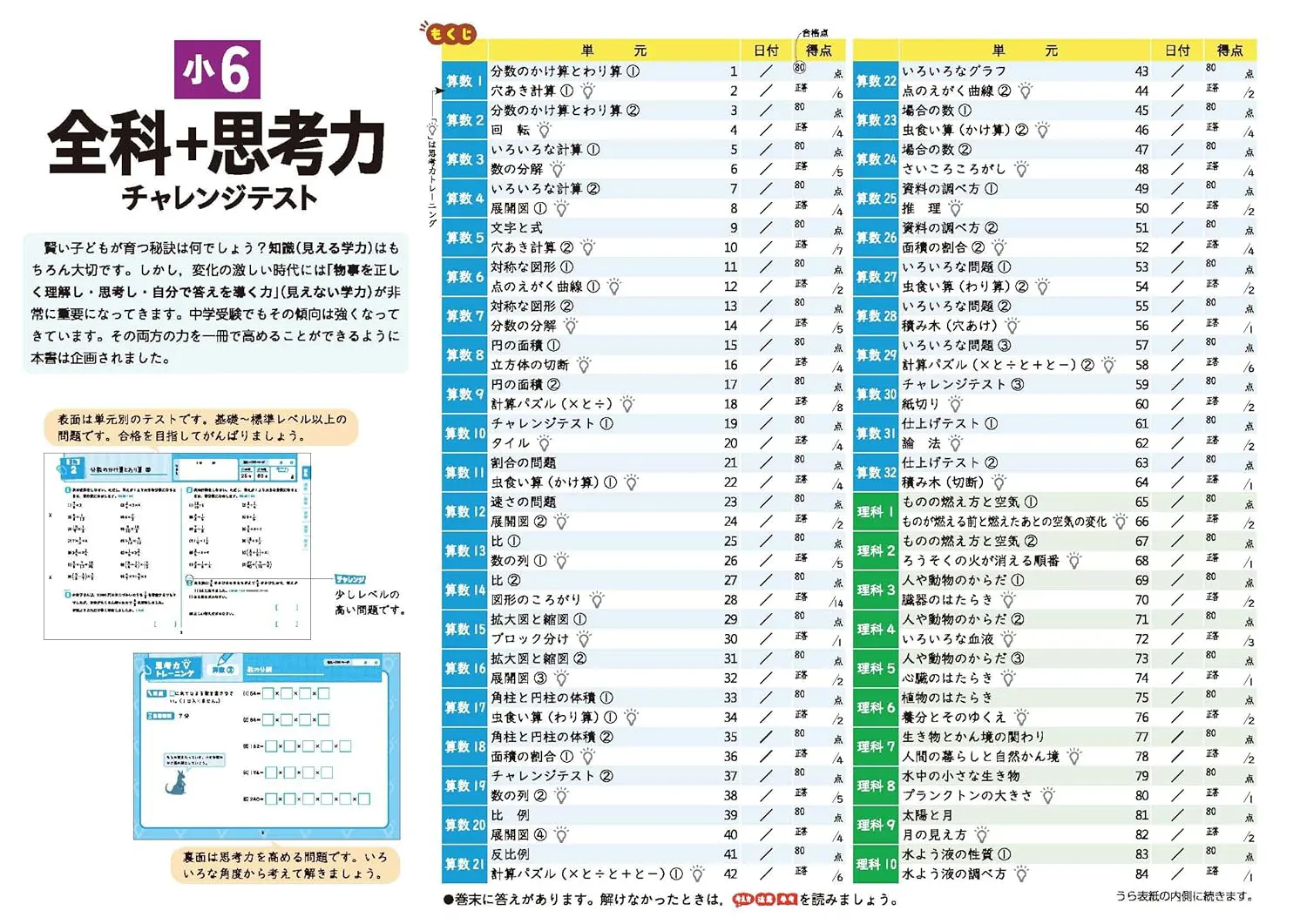 ◆「小6 チャレンジテスト 全科+思考力」は、表ページがテスト問題、裏ページが「思考力トレーニング」になったドリルです。