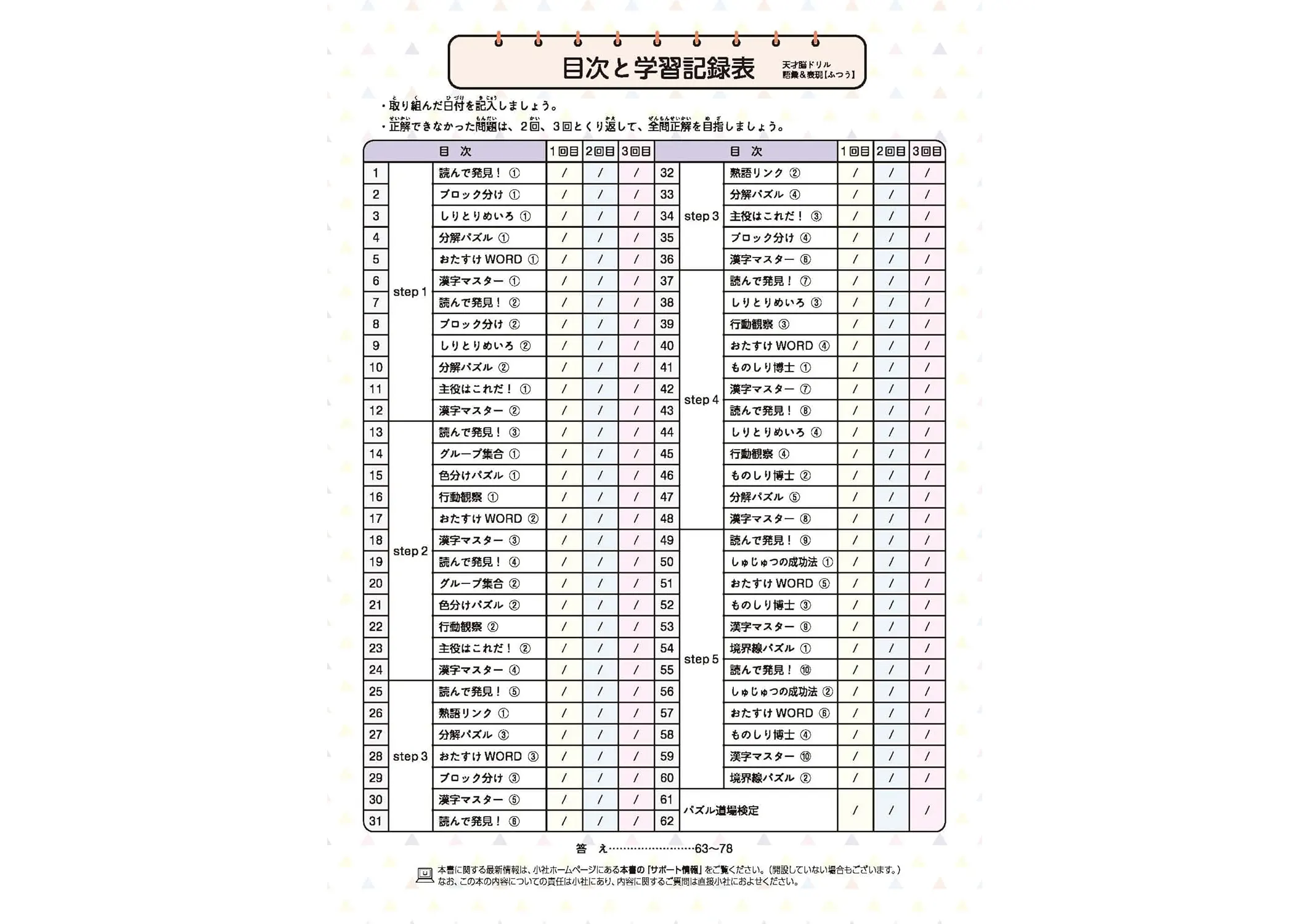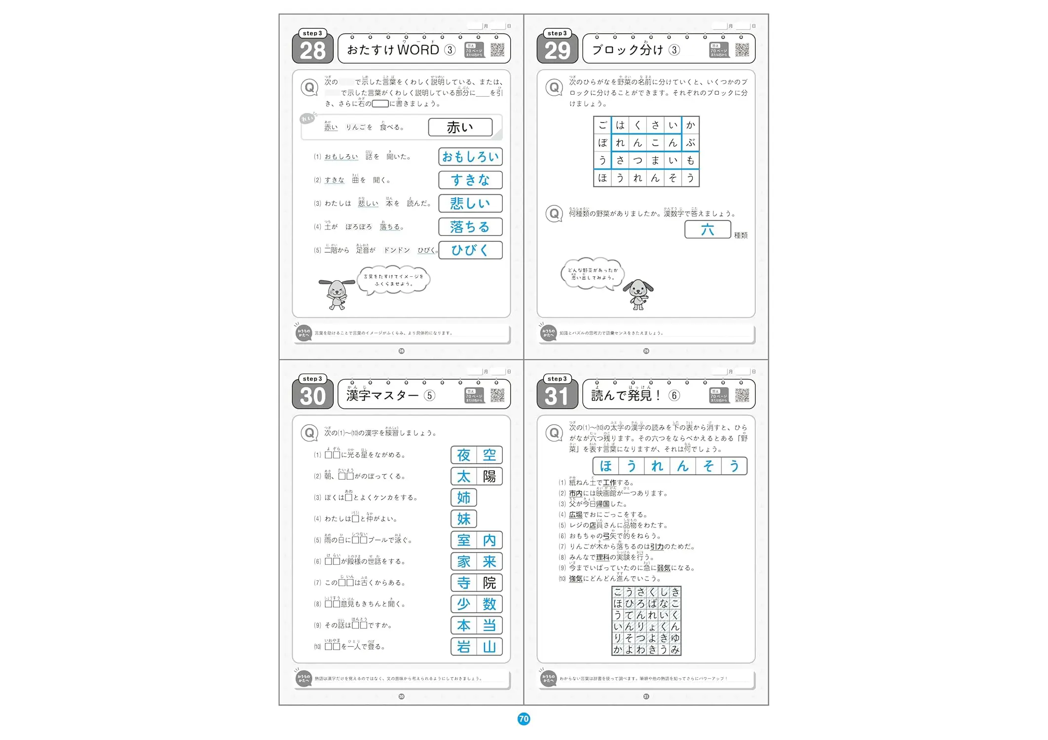 ・言葉や漢字、そして文法を迷路やパズルと組み合わせたドリルです。語彙力のほか思考力も高めます。
