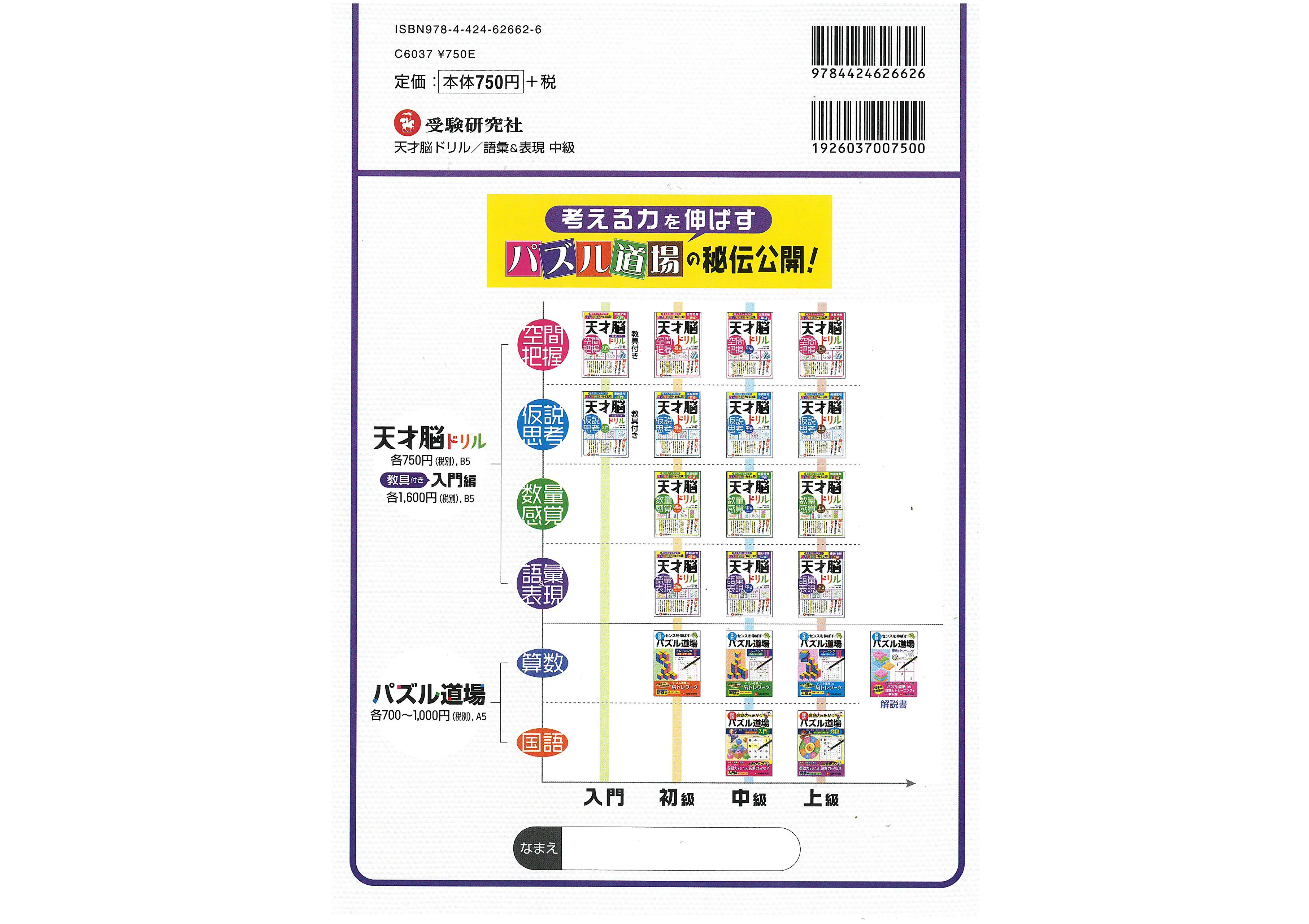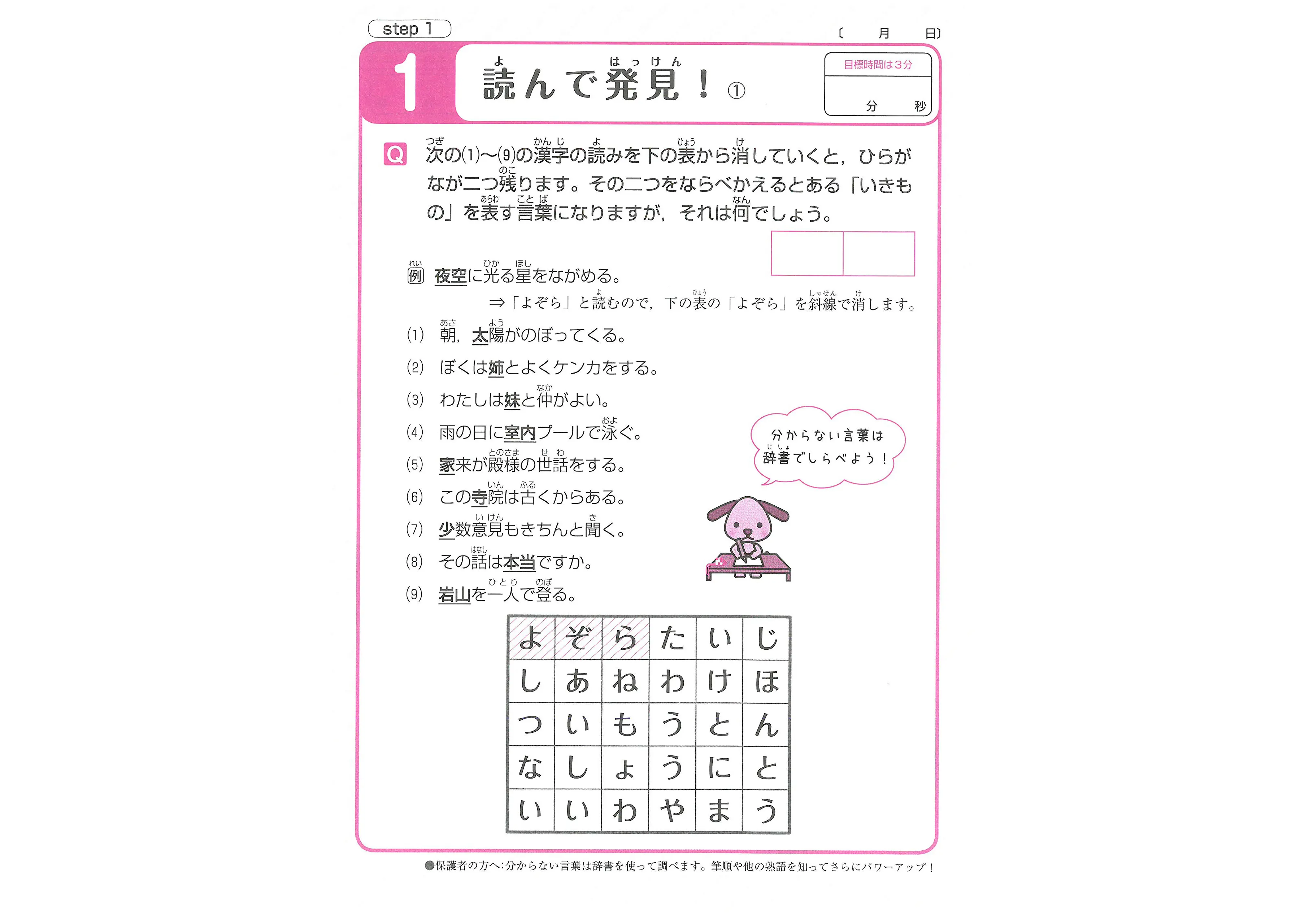 ○「物事を正しく理解し・思考し・自分で答えを導く力」が生き抜くためには必要です。この力を「調べる力・言葉の力・論理的に考える力」の3つの能力を育てながら身に付くようにします。 ○言葉を正しく速く調べる力がつくと,知識力や語彙力が高まり,それにより読解力もついてきます。また,正しく速く調べるときに試行錯誤するので,思考力の育成にもつながります。 ○漢字や言葉をただ単に覚えるのではなく,文章中にある言葉がどのような文脈や場面で使われていてどのような意味を持っているのかを意識していると言葉の力が身に付いてきます。 ○多くの優れた文章に触れたり,発信したい情報や読み取った情報を自身の頭の中で論理的に組み立てていくトレーニングを続けることで,論理的に考える力が身に付きます。 ○問題には,読んで発見!,漢字マスター,分解パズルなどがあり,繰り返し取り組み,能力を育成します。 ○初級・中級・上級の3つのレベルを設けていますので,自分に合ったレベルに取り組み,段階を踏んで力をつけることができます。