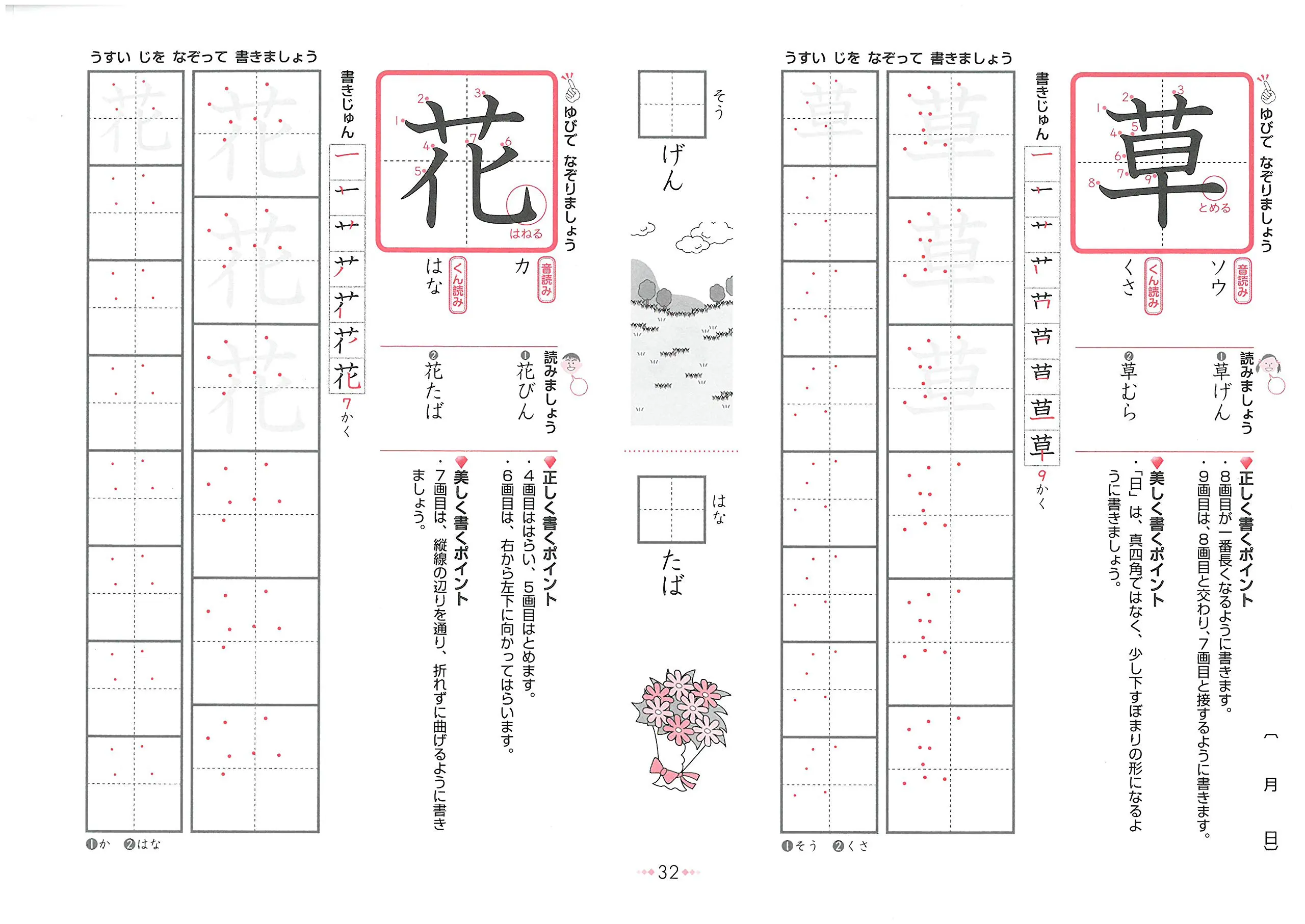○1ページ2字ずつを練習します。漢字をなぞる練習だけでなく,音読み・訓読みをはじめ,熟語などを取り上げて,漢字1字1字を学びながら,覚えていきます。 ○漢字1つ1つに書き順・総画数,「正しく書くポイント」「美しく書くポイント」を示していますので,指導者の手引きになります。 ○「文を書きましょう」では,漢字1字ずつでなく,漢字を使った正しく美しい文を書けるようにします。