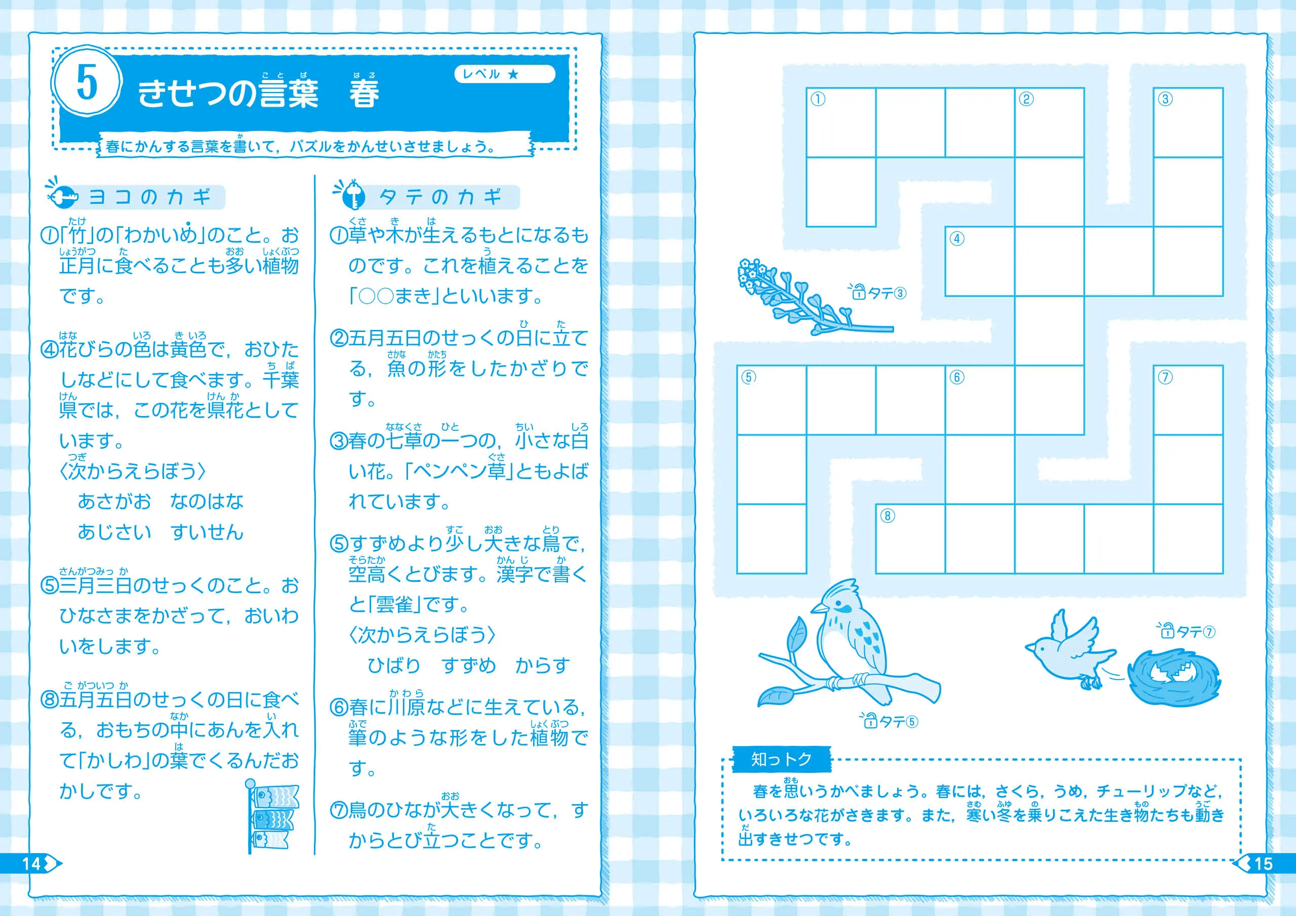 ○クロスワードに取り上げられることばは,漢字の読み・ことわざ・類義語・対義語のほかに,季節に関することばや動植物などに関することばなどがあります。ことばを正しく覚え,読解力,作文力などを伸ばします。