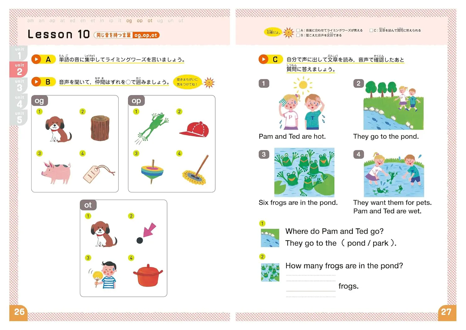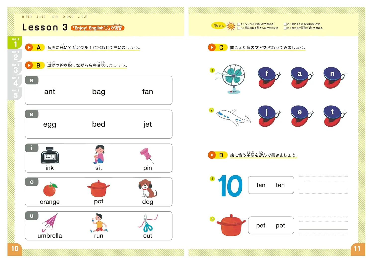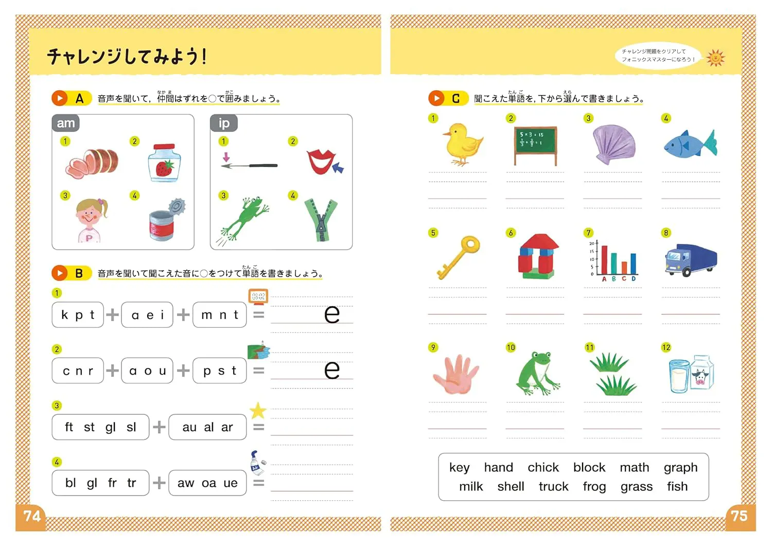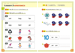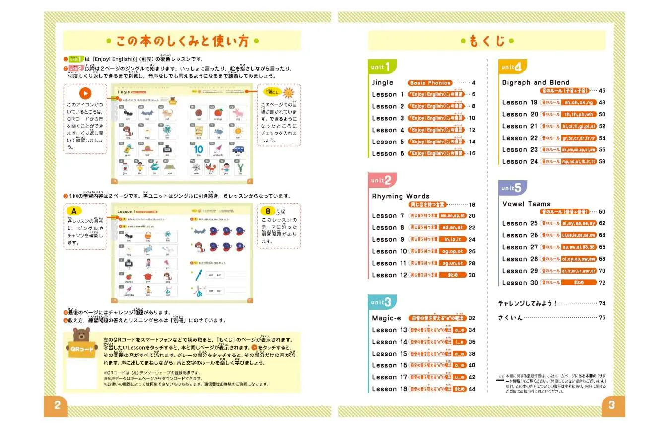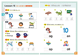 フォニックスとは、英単語のつづりと発音のルールのことで、知っていれば全英単語の7、8割が発音できると言われています。英語圏の多くでは、幼児期にフォニックスを学んでいるんですよ。この教材は、英語を学び始めた小学生はもちろん、幼児期のお子様でも楽しく進められるよう、1レッスンは集中しやすい10分程度。カラフルなイラスト満載でやる気も語彙もアップ。リズムにのって楽しく学べるので英語がもっと楽しくなります!