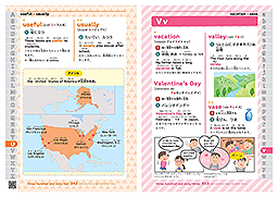 ○見出し語(英和)には意味に加え,発音記号とそのカナ表記を付け,読み方もきちんと身につくようにしています。また,イラストやマンガを使い,より親しみやすくしています。