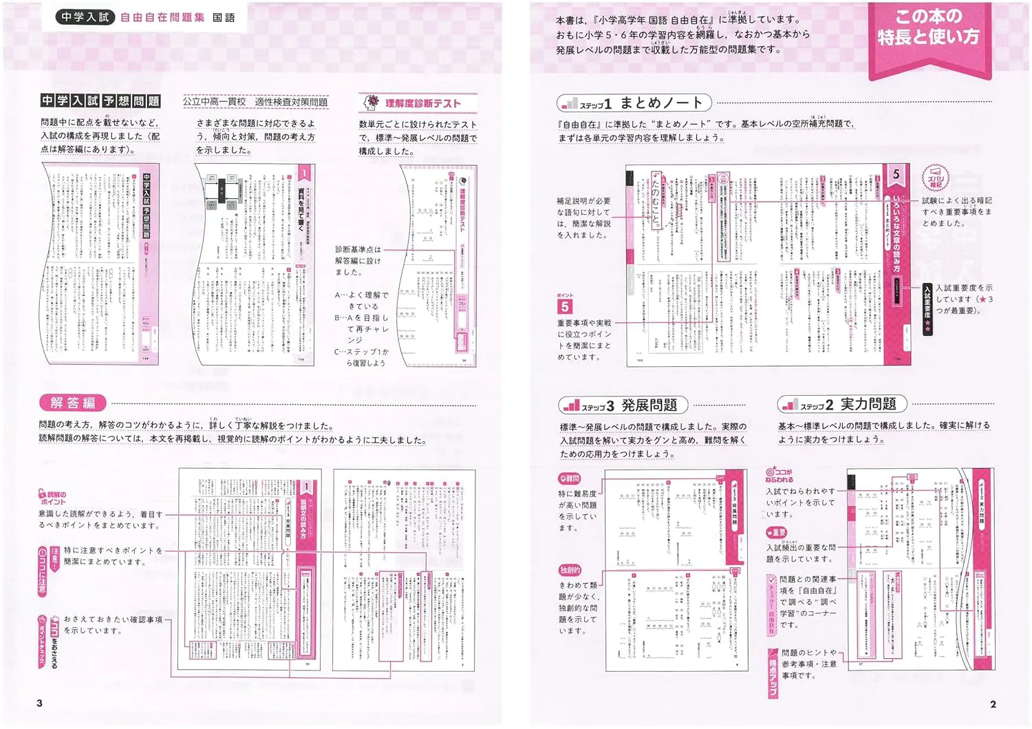 本書は、おもに小学5・6年の学習内容と中学入試に頻出の発展内容を凝縮。3ステップで基礎から難関校入試対策までムリなく力がつく問題集です。巻末には、中学入試予想問題に加えて、公立中高一貫校の入試にも対応できるように、適性検査の対策問題も収録しています。