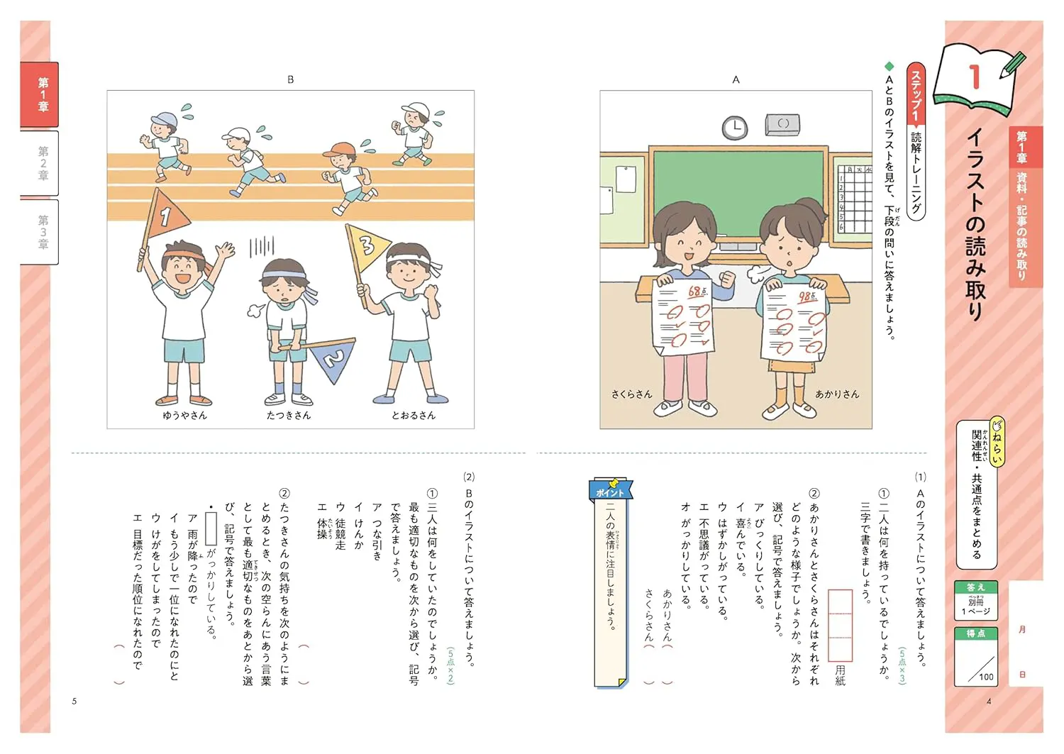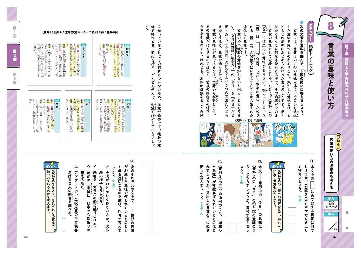 マンガやイラスト、資料、算数や理科・社会の身近な知識など、多彩な題材を使用することで、興味・関心を広げながら、多角的に読解力と記述力を伸ばします。