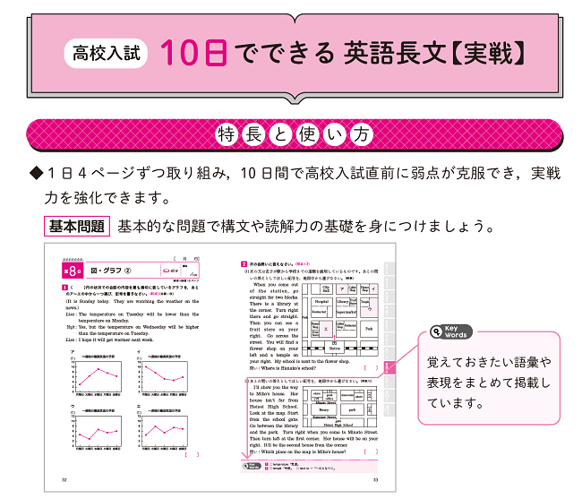 「高校入試」では、第1日~第7日に単元別配列で実力が身についているかを確認。第8日~第 10日に中学3年分の予想問題でまとめて実力を試すことができます。