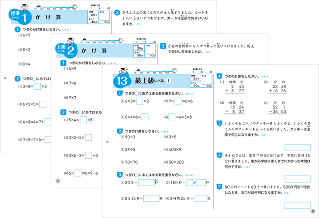 漢字も計算も1頁を目標5分の「タイムアタック」で解く練習をします。巻末の「学習の記録」には、正答数だけでなく、解くためにかかった時間を記入することで、実力がアップしたかどうかを一目で確認することができます。