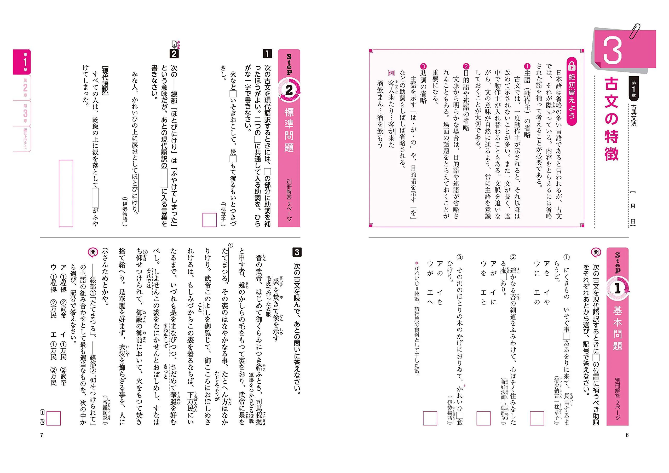 Step2......入試の基礎固めにぴったりな標準問題 ・標準的な入試レベルの問題で構成しています。 ・入試の基礎固めができるステップです。 Step3......さらに力をつける実力問題 ・Step2よりレベルの高い入試問題を掲載。 ・実力アップのためのステップです。