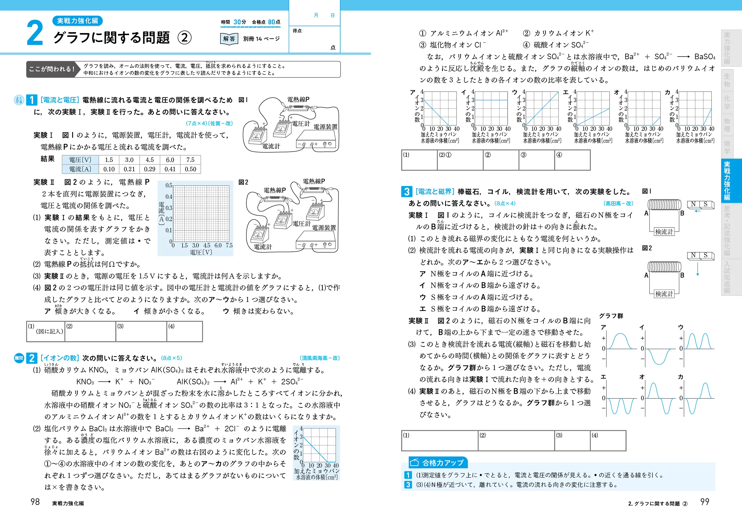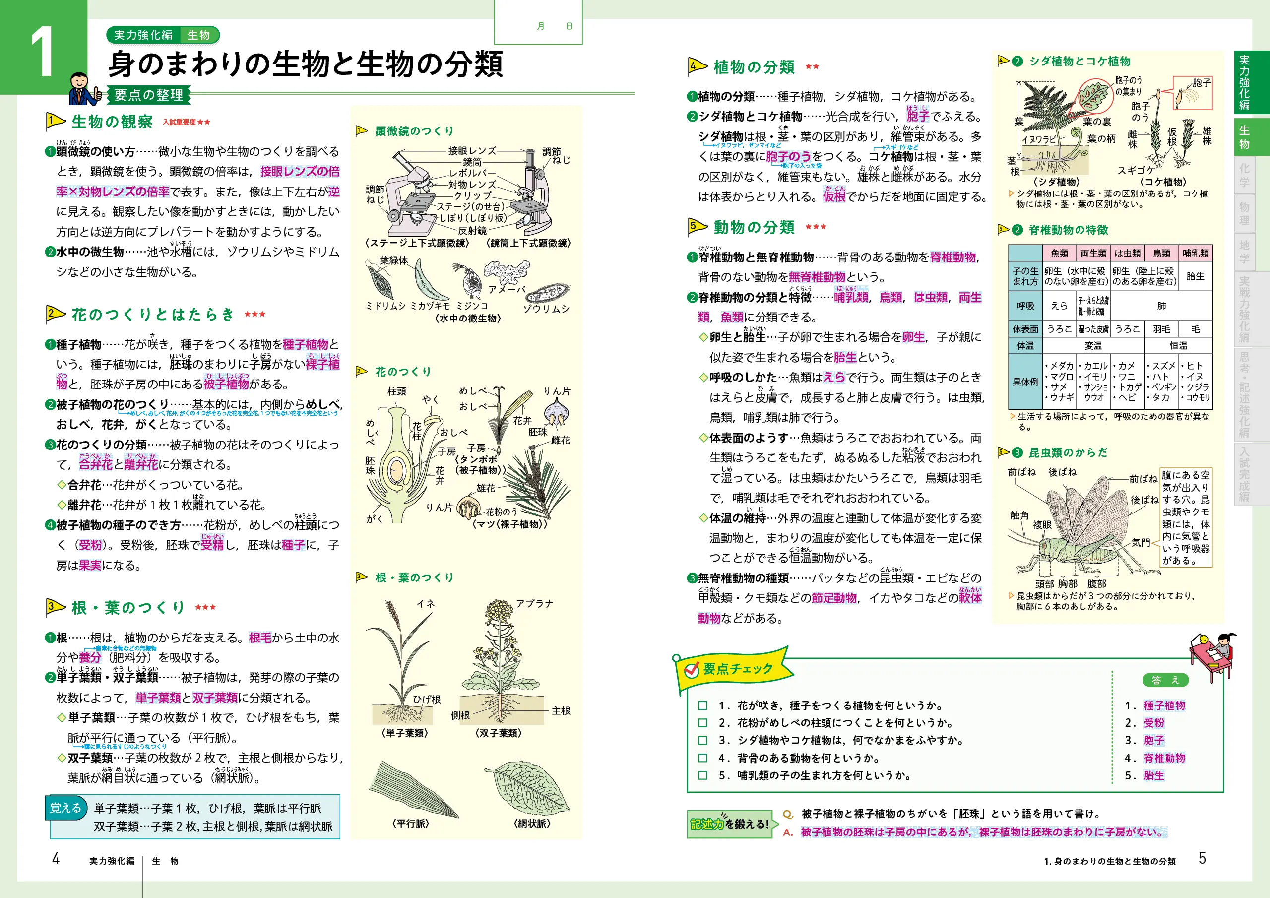 ・実力強化編...図・表・写真などを用いた「要点の整理」で重要知識が簡潔にまとまられているので,知識を整理してから問題に取り組むことができます。また,見開き2ページの「実力問題」では標準レベルの入試問題に取り組むことができます。