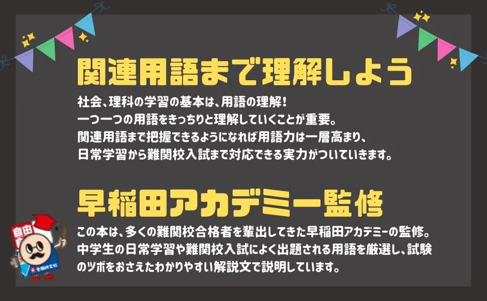 さらに、関連用語まで把握できるようになれば用語力は一層たかまり、日常学習から難関校入試まで対応できる実力がついていきます。
