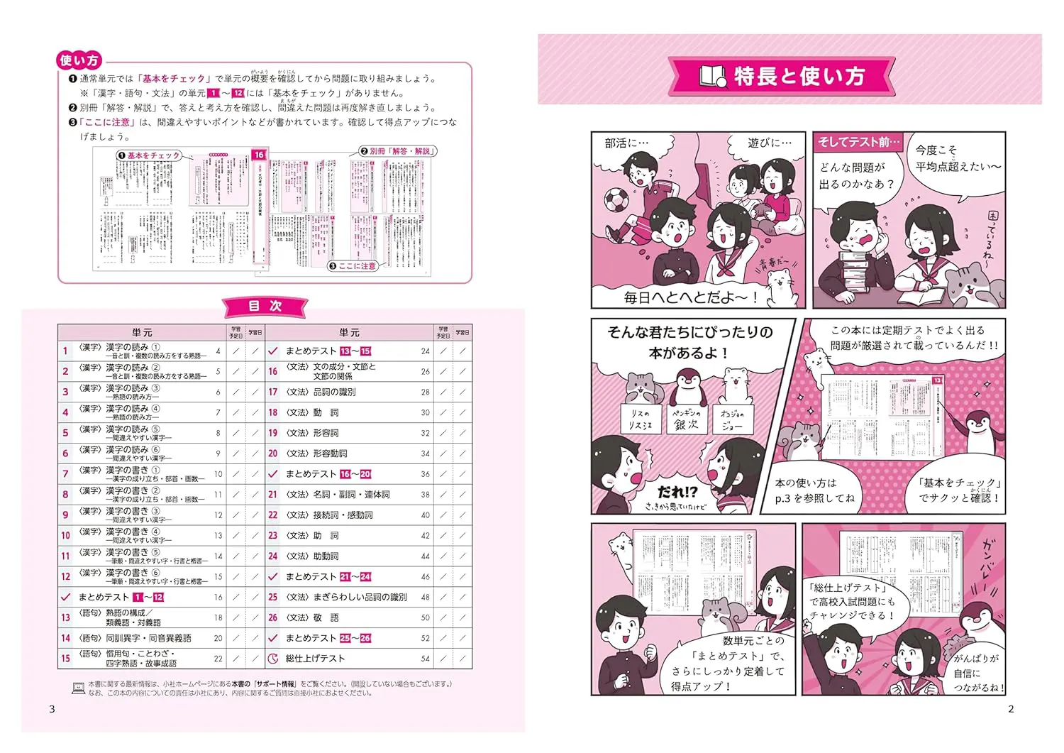 定期テストでは、どれだけ多くのパターンの問題に触れてきたかで差が出ます。本書は、さまざまなパターンの問題を取り上げており、平均点をこえたいけど今ひとつ点数が伸びない、できる教科とできない教科の差があるというような中学生におすすめの問題集です。厳選56ページ(英語長文は40ページ)の薄型タイプで、取り組みやすいのもポイントです。