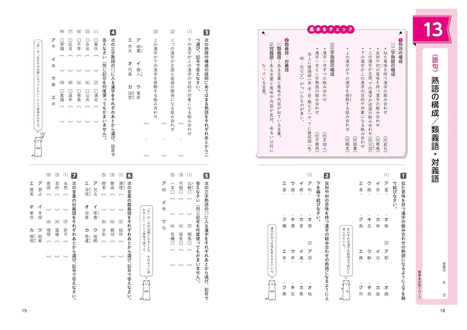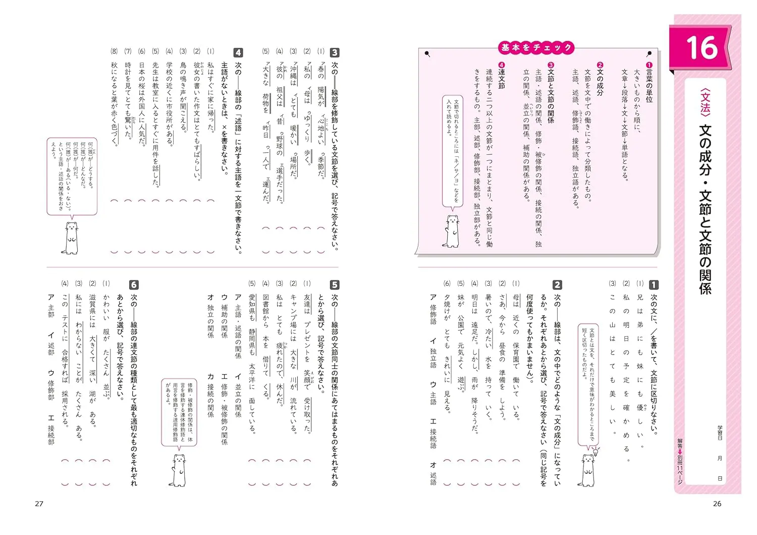 ・さまざまなパターンの問題を取り上げている「中学 トレーニングノート 漢字・語句・文法」は、平均点は取れるけど、今ひとつ点数が伸びない人におすすめの問題集です。