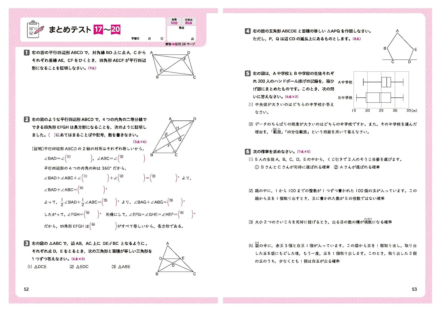 定期テストでは、どれだけ多くのパターンの問題に触れてきたかで差が出ます。本書は、さまざまなパターンの問題を取り上げており、平均点をこえたいけど今ひとつ点数が伸びない、できる教科とできない教科の差があるというような中学生におすすめの問題集です。厳選56ページ(英語長文は40ページ)の薄型タイプで、取り組みやすいのもポイントです。