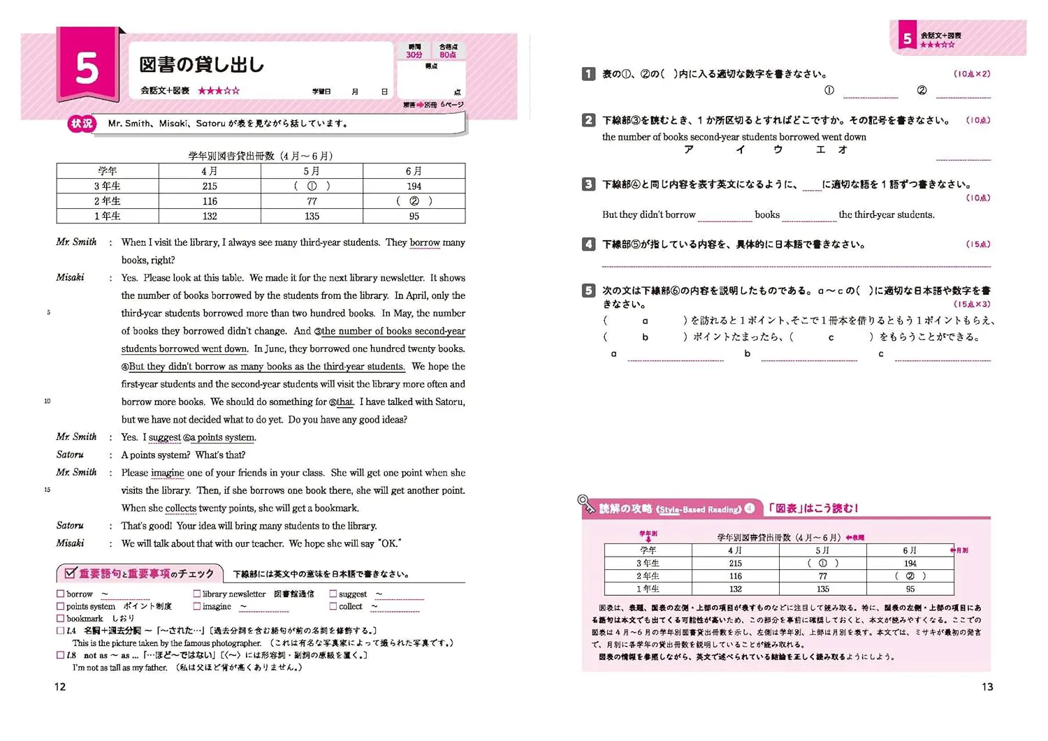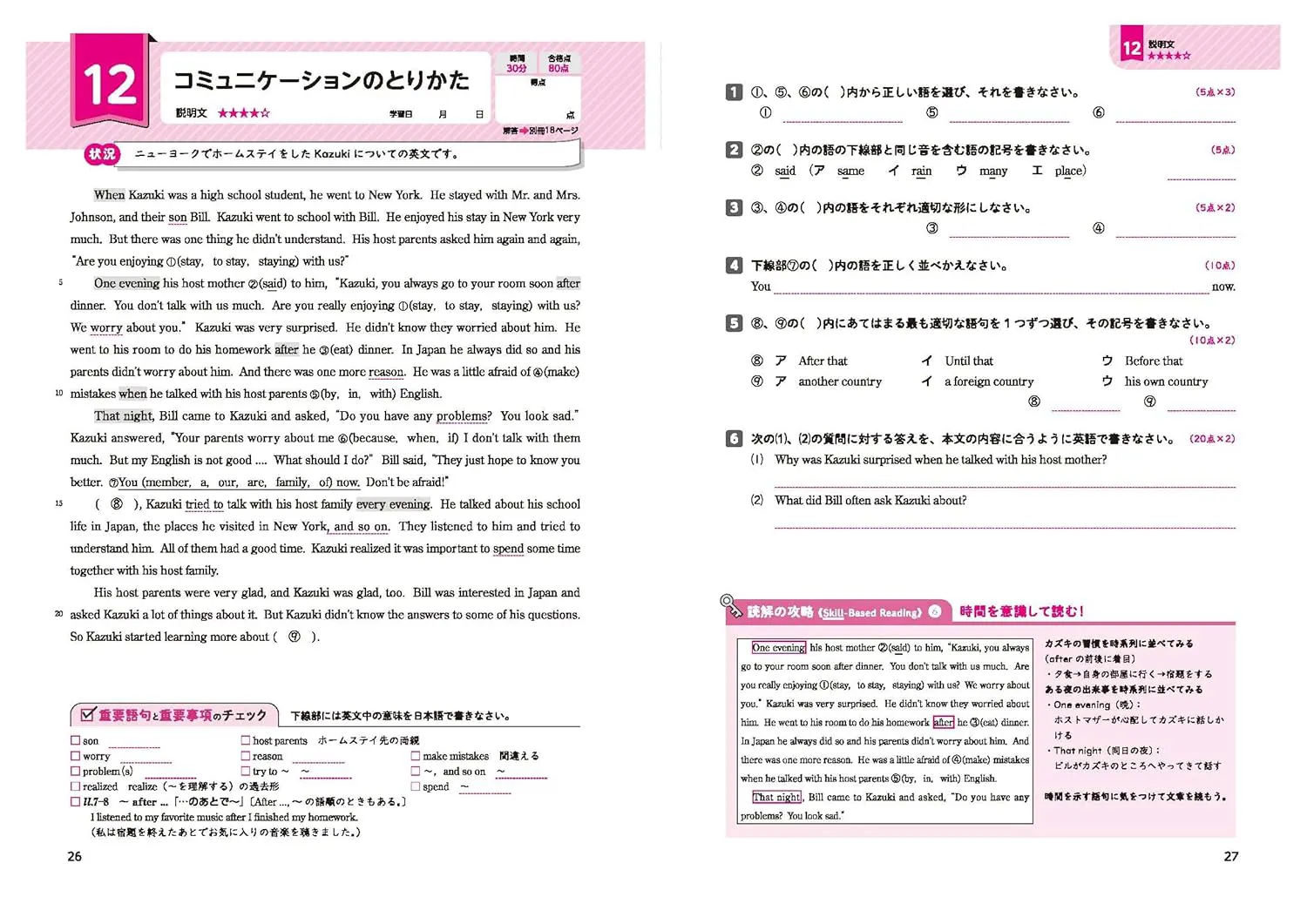 ▶1単元は2~3ページ構成。身近なテーマを取り上げた文や会話文を読みます。