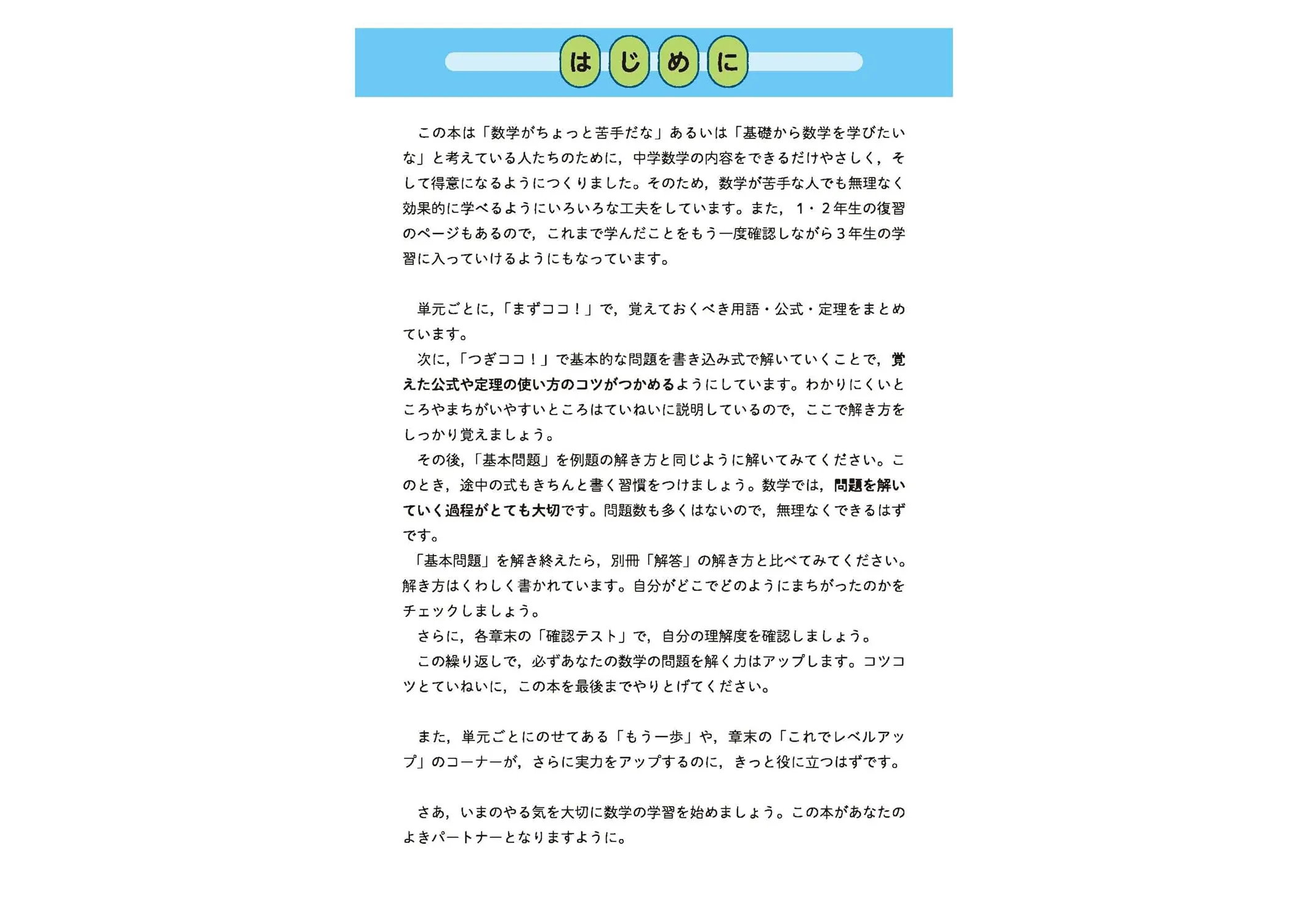 この本は、数学/英語が苦手と感じていたり、しっかり基礎から学びたいと考えている中学生のためにつくりました。それぞれの単元で最も基本的で重要な部分をむだなく学習できるように工夫しています。ノート式まとめ+やさしい問題で、「わかった!」がふえていく基礎問題集です。