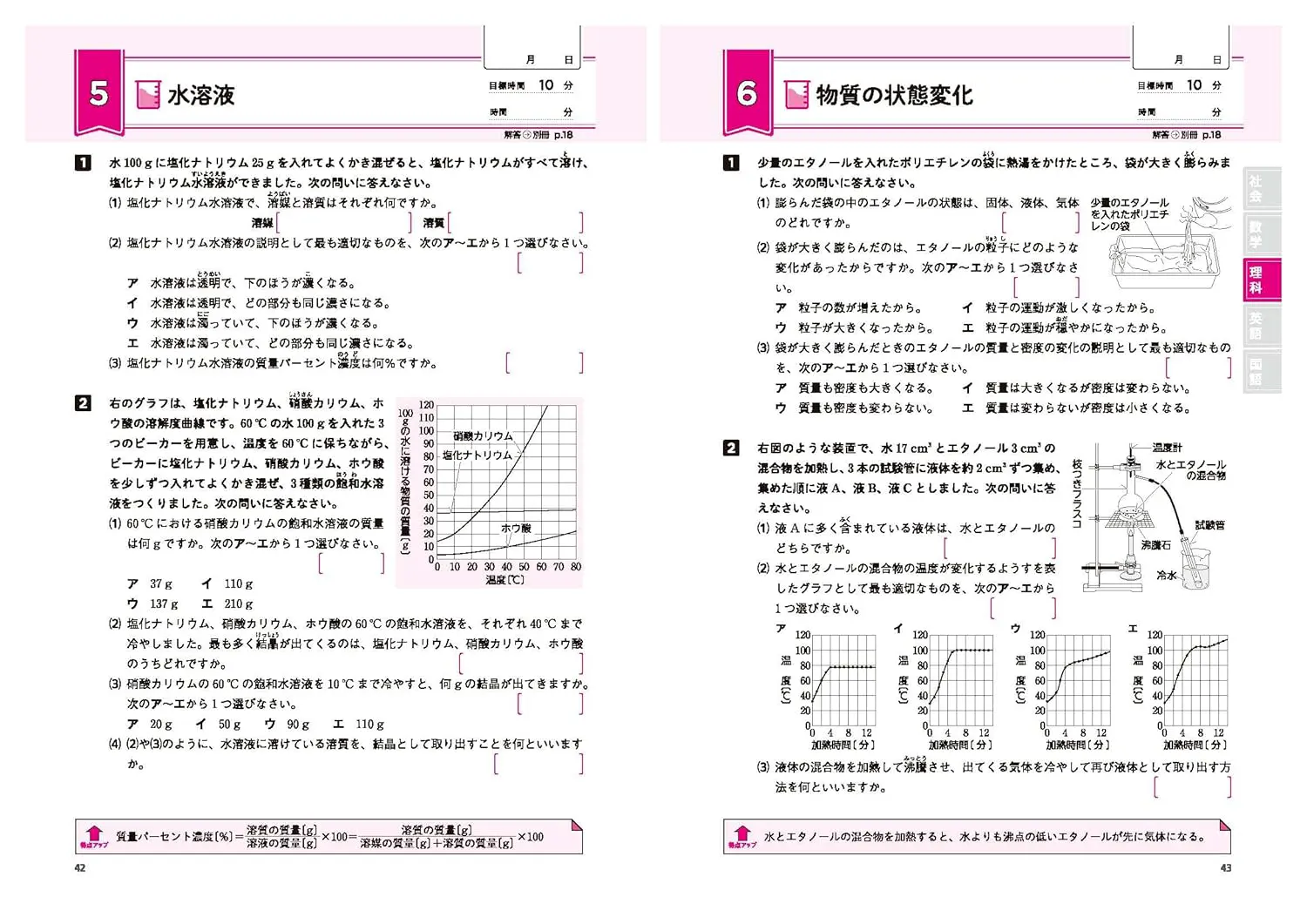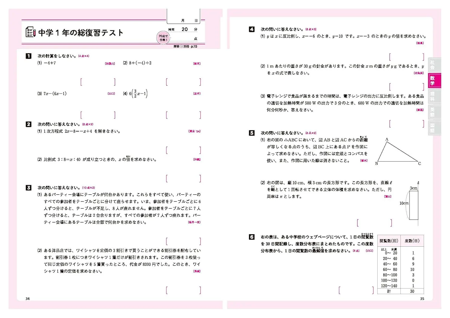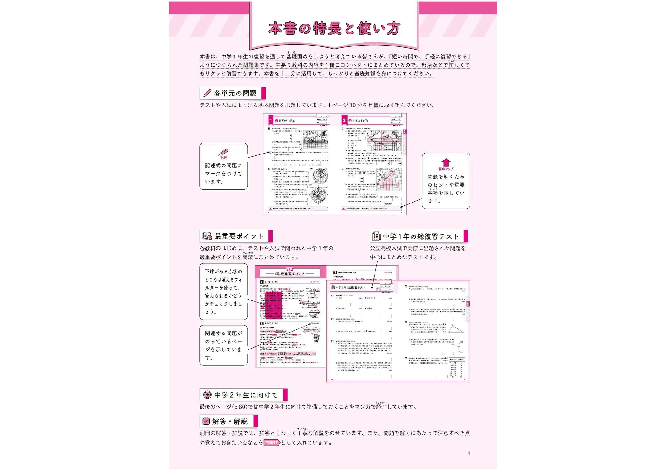 中1の最重要問題を厳選。これ1冊で、中1 主要5教科の基礎力が身につく問題集です。【1単元1ページ・10分】でできる問題構成で、部活などが忙しい人でも続けやすいのもおすすめポイント。中間・期末の定期テスト対策はもちろん、冬・春休み前の総復習、中2生の中1総復習にも最適です。