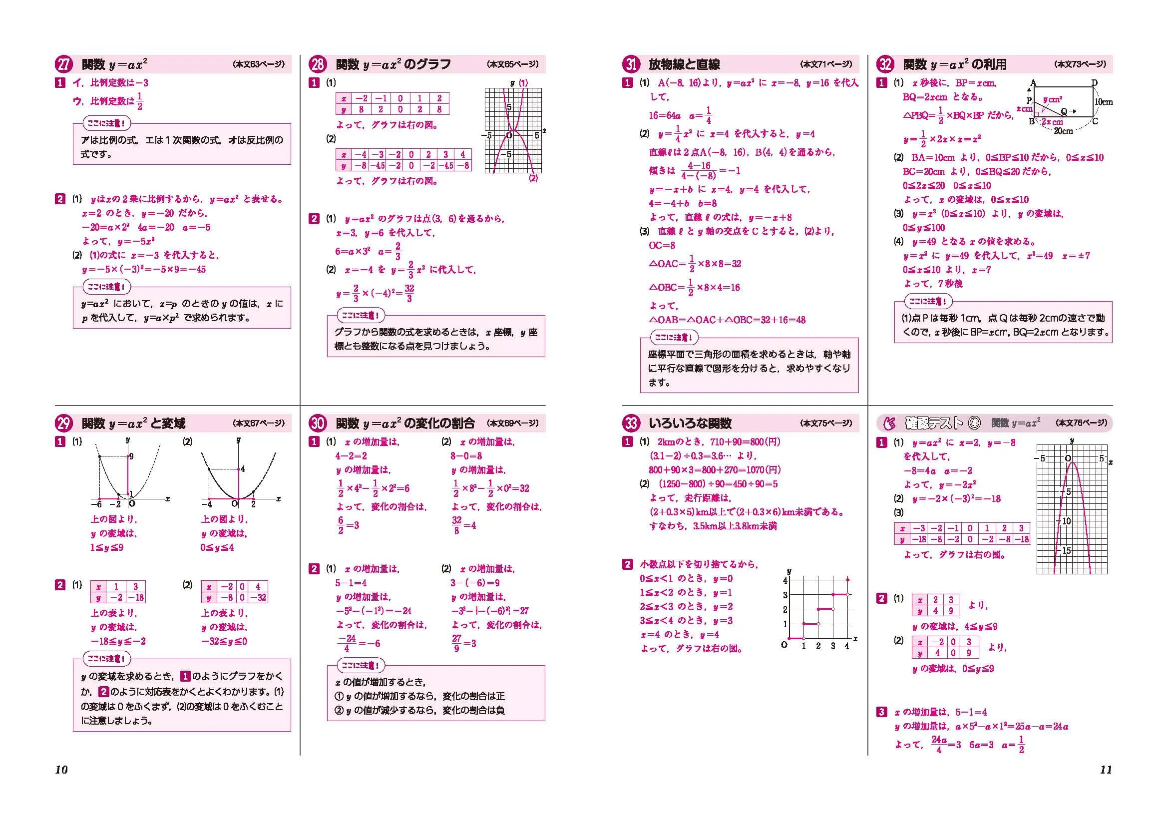 ・各章のはじめに,適宜中学1年と中学2年の単元を設け,1冊で中学1年と中学2年の復習もできるようにしています。
