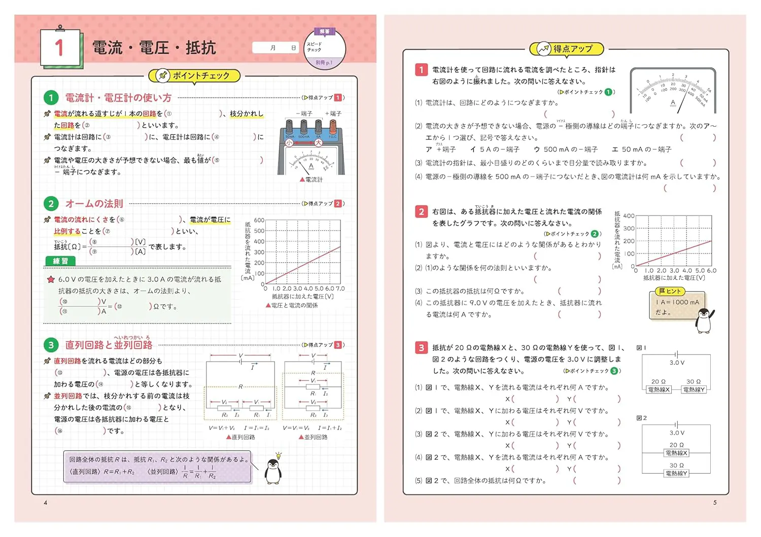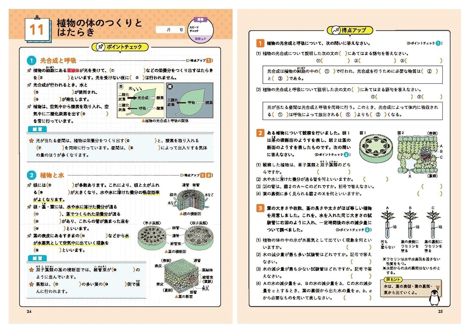 1回分は見開き2ページの構成。まず半分の「ポイントチェック」の穴埋め式問題で、教科書の中でも特に重要なポイントや解き方をインプットしてから、もう半分の「得点アップ」でどのように出題されるのかを問題演習を通じて学んでいきます。