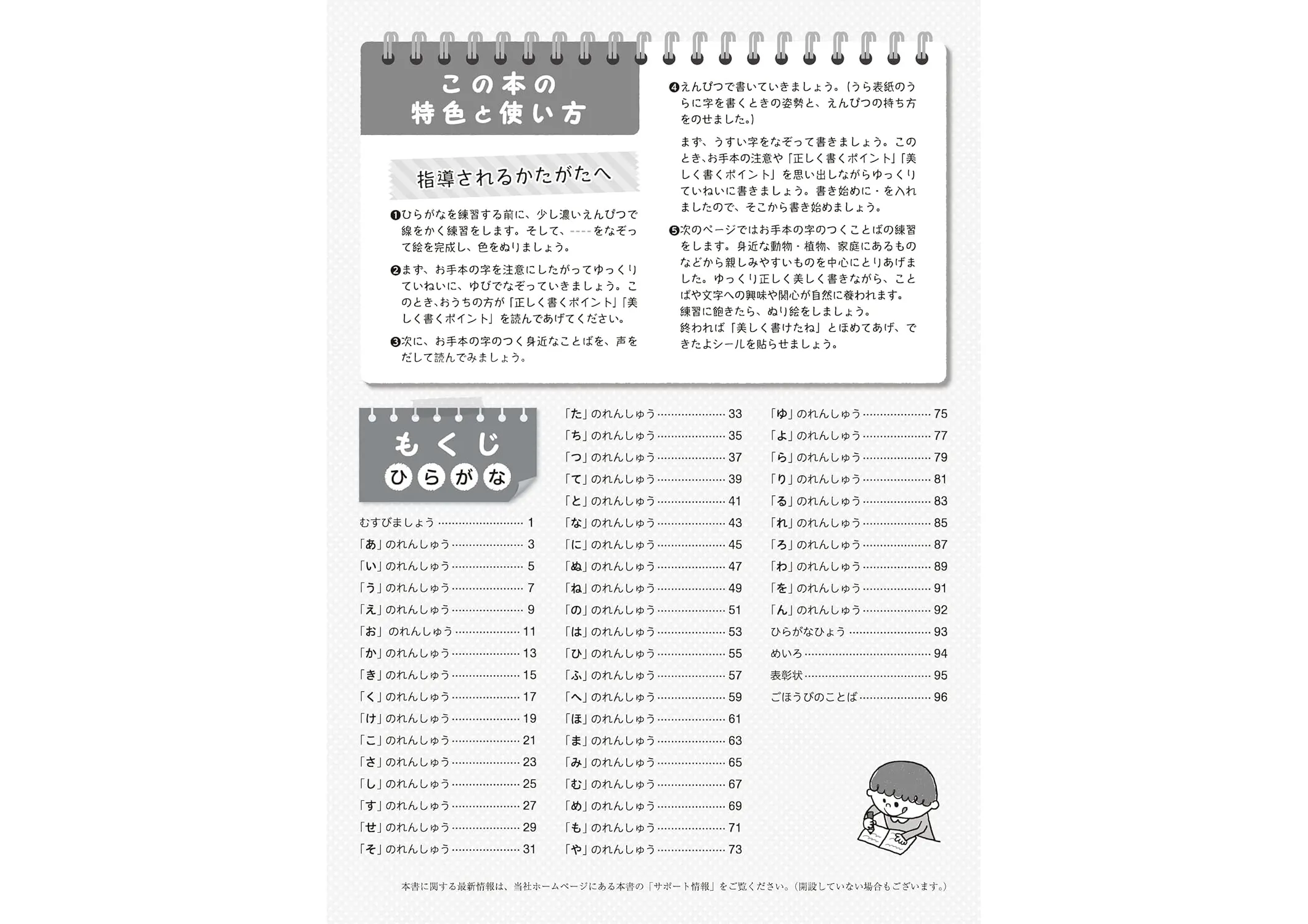 この本は、ひらがな・カタカナの練習をはじめた就学前~小学1年生くらいの児童におすすめの教材です。A4大判サイズでのびのび練習することができ、きれいに正しく書くポイントつきで保護者が教えやすくしています。ぬり絵やしりとりなどのミニコーナーも楽しみながら、できたよシールや表彰状でやる気や達成感を高めていきます。