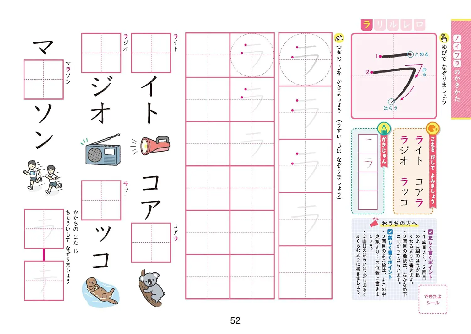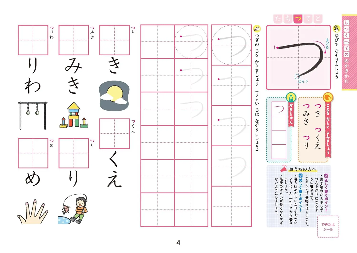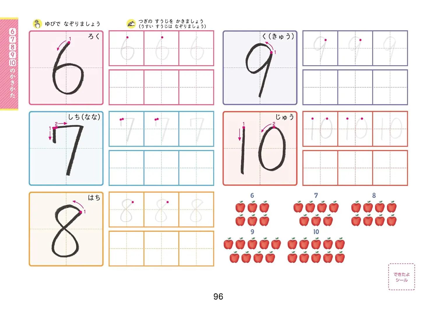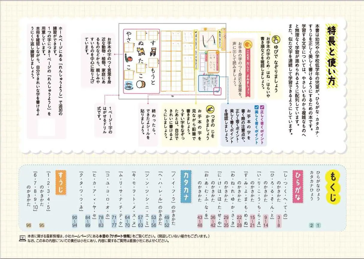 この本は、1冊で「ひらがな」「カタカナ」「数字」の3種類の文字を練習できます。文字はどうにか書けるけど、クセ字が心配。そんな就学前~小学1年生くらいのお子さんにおすすめの教材です。お手本は、えんぴつに慣れはじめた幼児や小学生がなぞりやすい、書道家の先生が書いた手書き文字にしており、学習する文字については、やさしいものから複雑なものへと無理なく学習が進められるように配列しています。