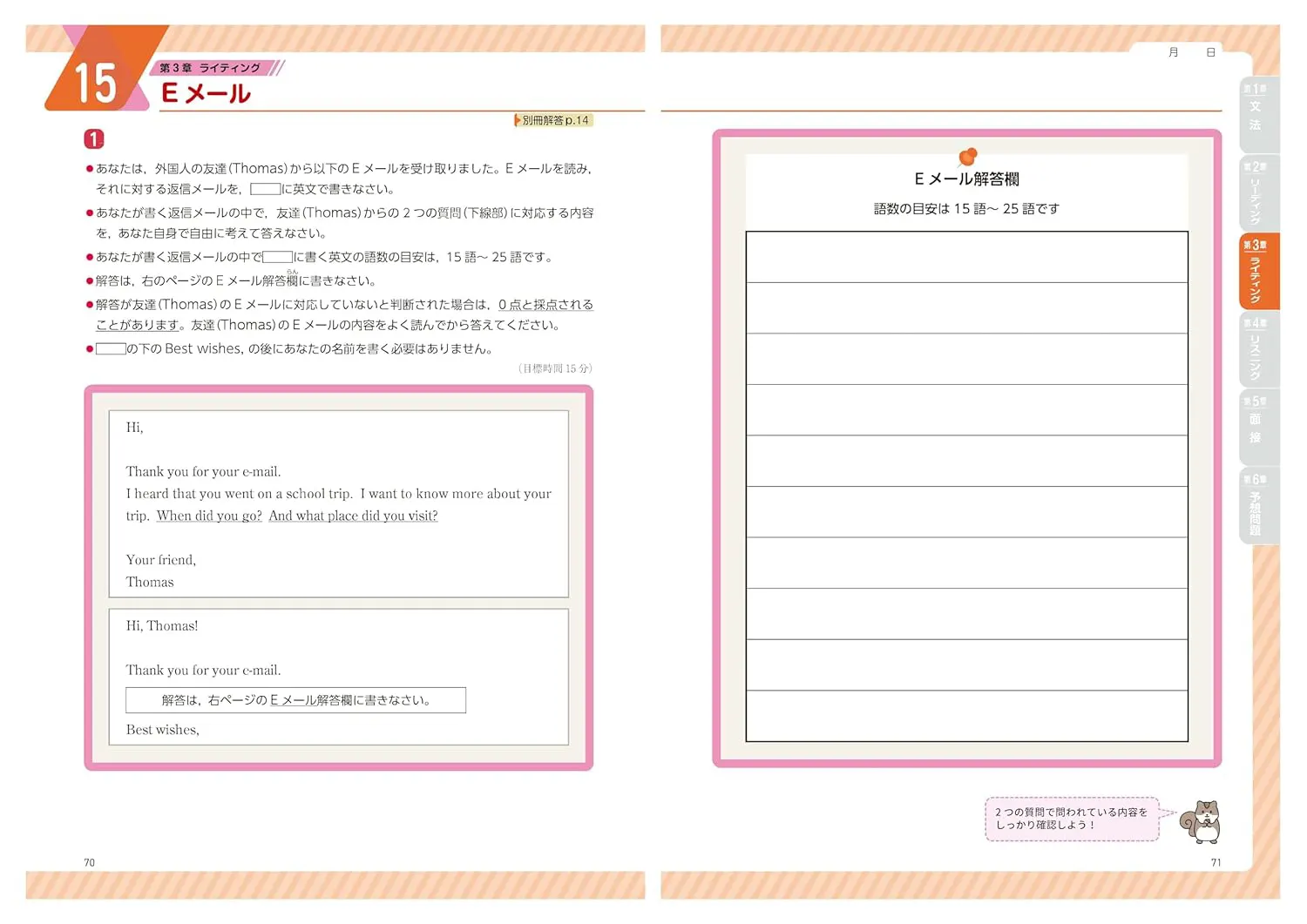 英検対策には文法学習が欠かせません。「文法」の単元は4ページのうち、前半2ページを文法のまとめと確認問題にしました。