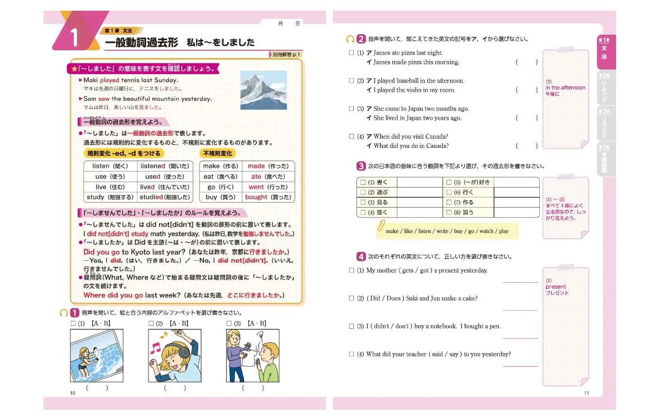 筆記試験からリスニングまで、英検4級対策が1冊でできる問題集です。