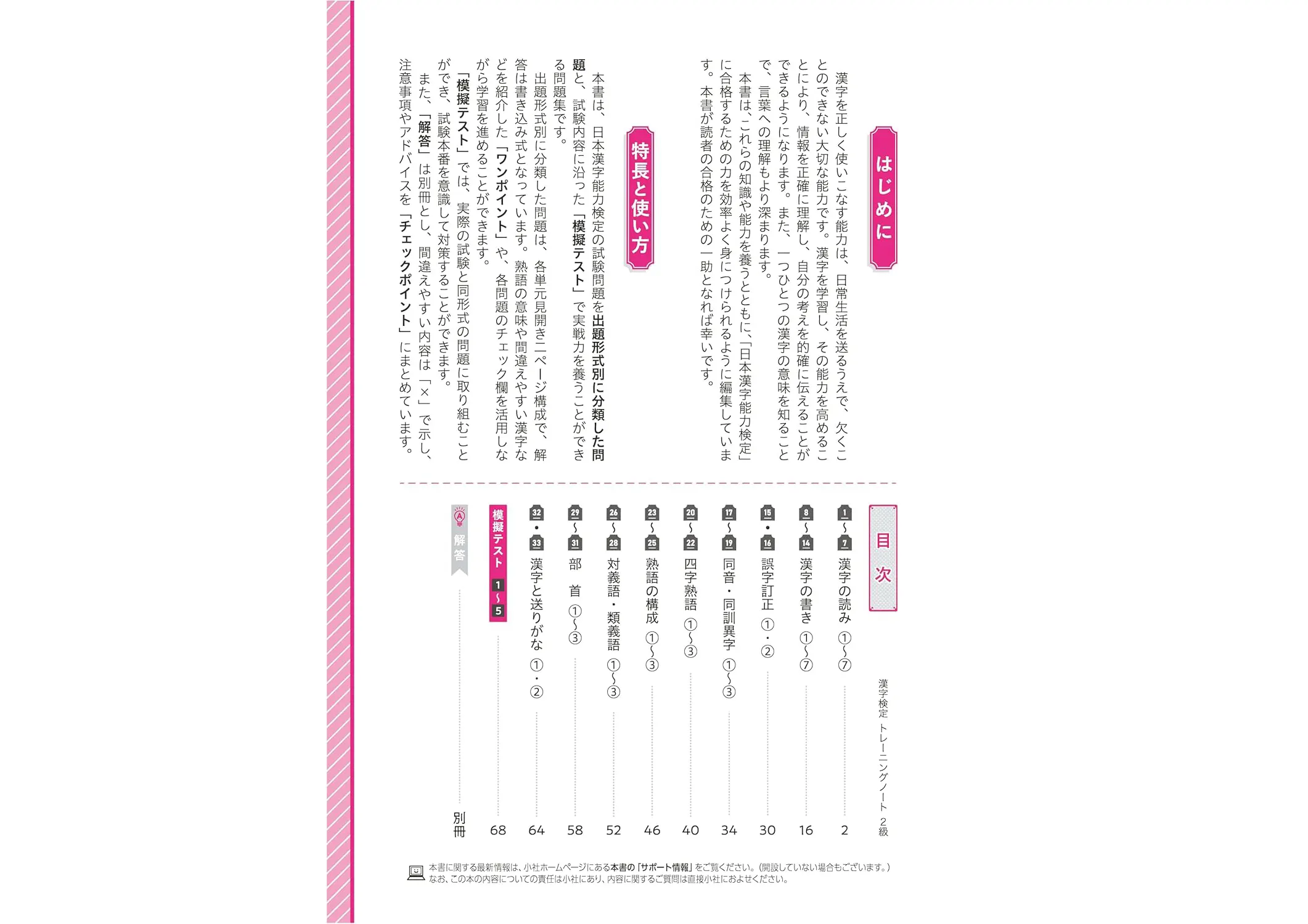 漢検対策として、毎日の学習はもちろん「苦手分野の対策」や「直前の仕上げ」まで目的に合わせて幅広く使える問題集です。薄手で取り組みやすいのもおすすめポイント。2級、準2級~10級 全10種の幅広いラインナップなので、同じシリーズでスムーズにステップアップも可能です。小・中・高校生から社会人の方までお使いいただけます。
