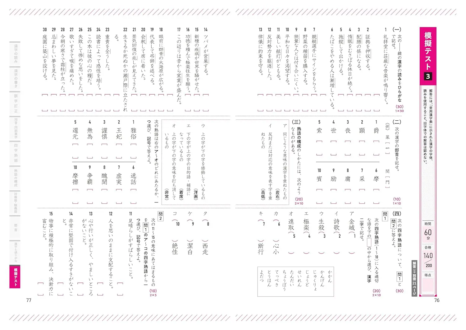 ・「漢字の読み」「漢字の書き」「同音・同訓異字」「四字熟語」など、出題形式別なので漢検対策にぴったり。苦手分野対策にも最適です