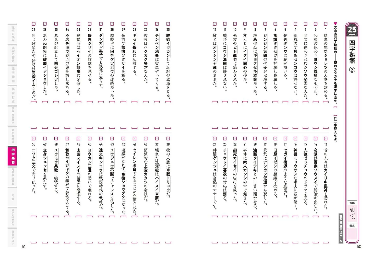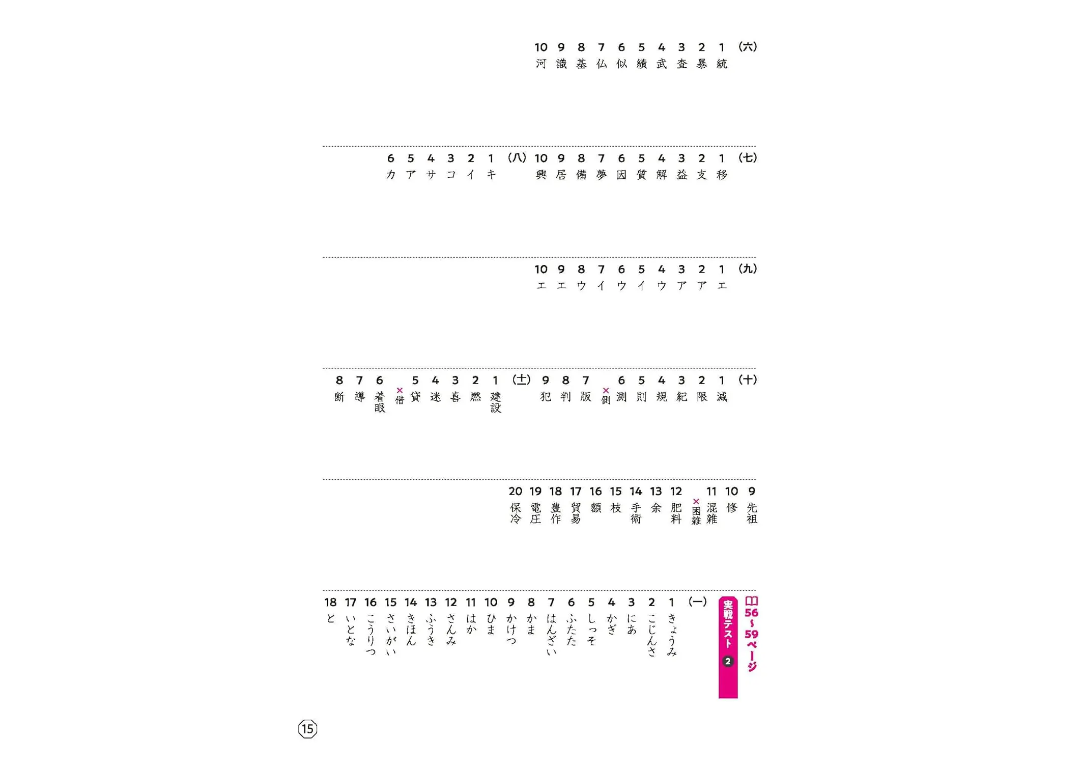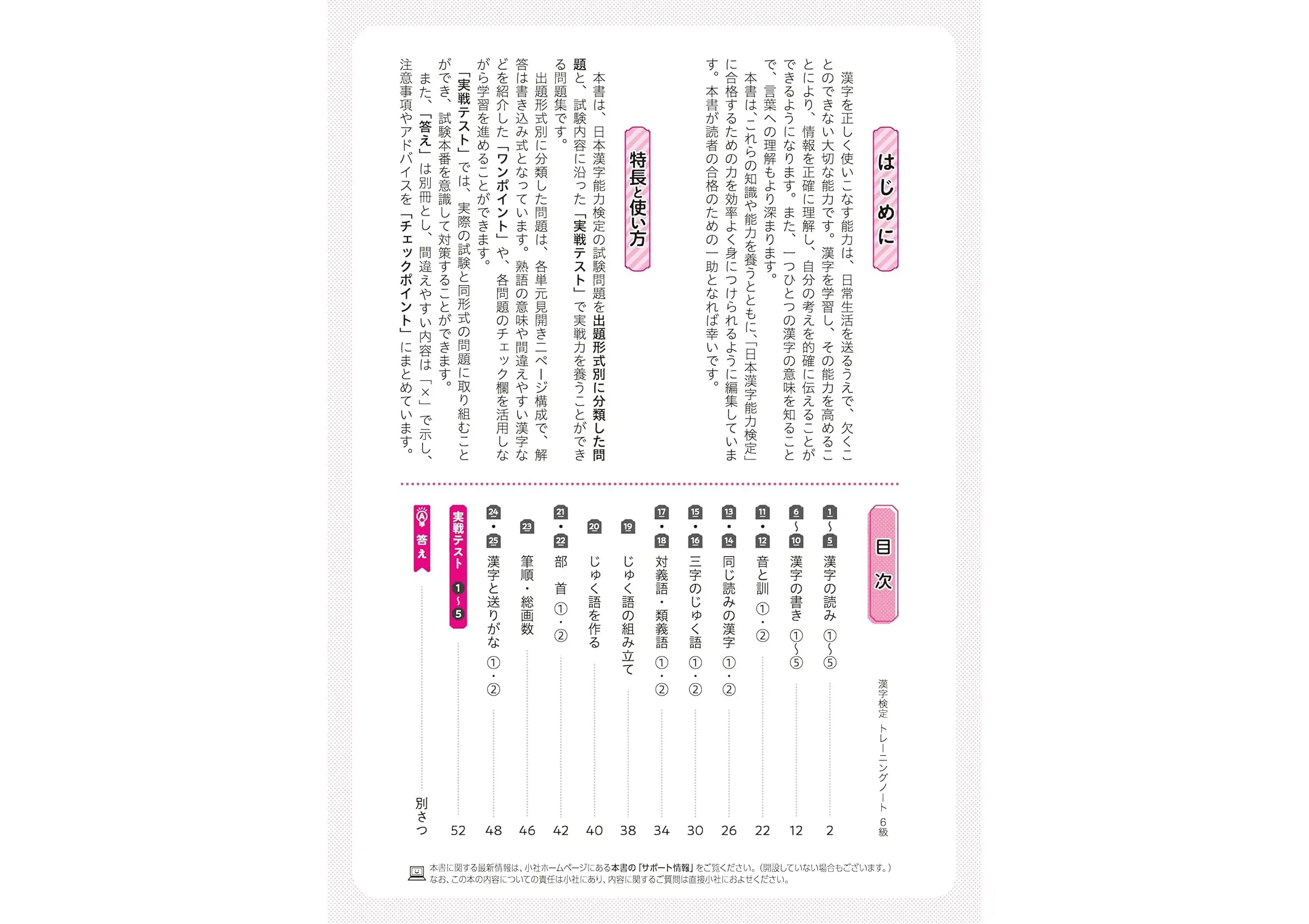 ・「漢字の読み」「漢字の書き」「同じ読みの漢字」「対義語・類義語」など、出題形式別なので漢検対策にぴったり。苦手分野対策にも使えます