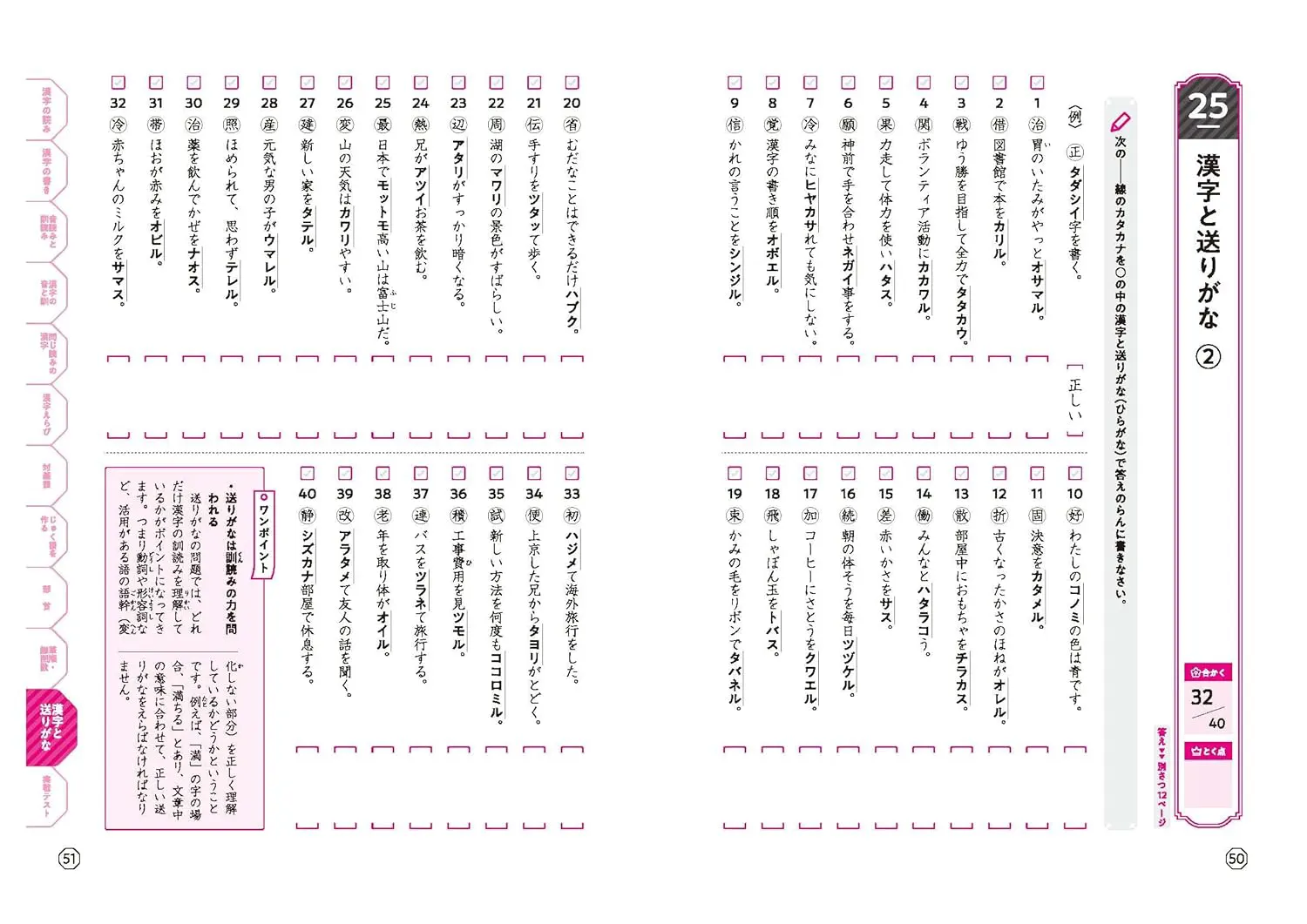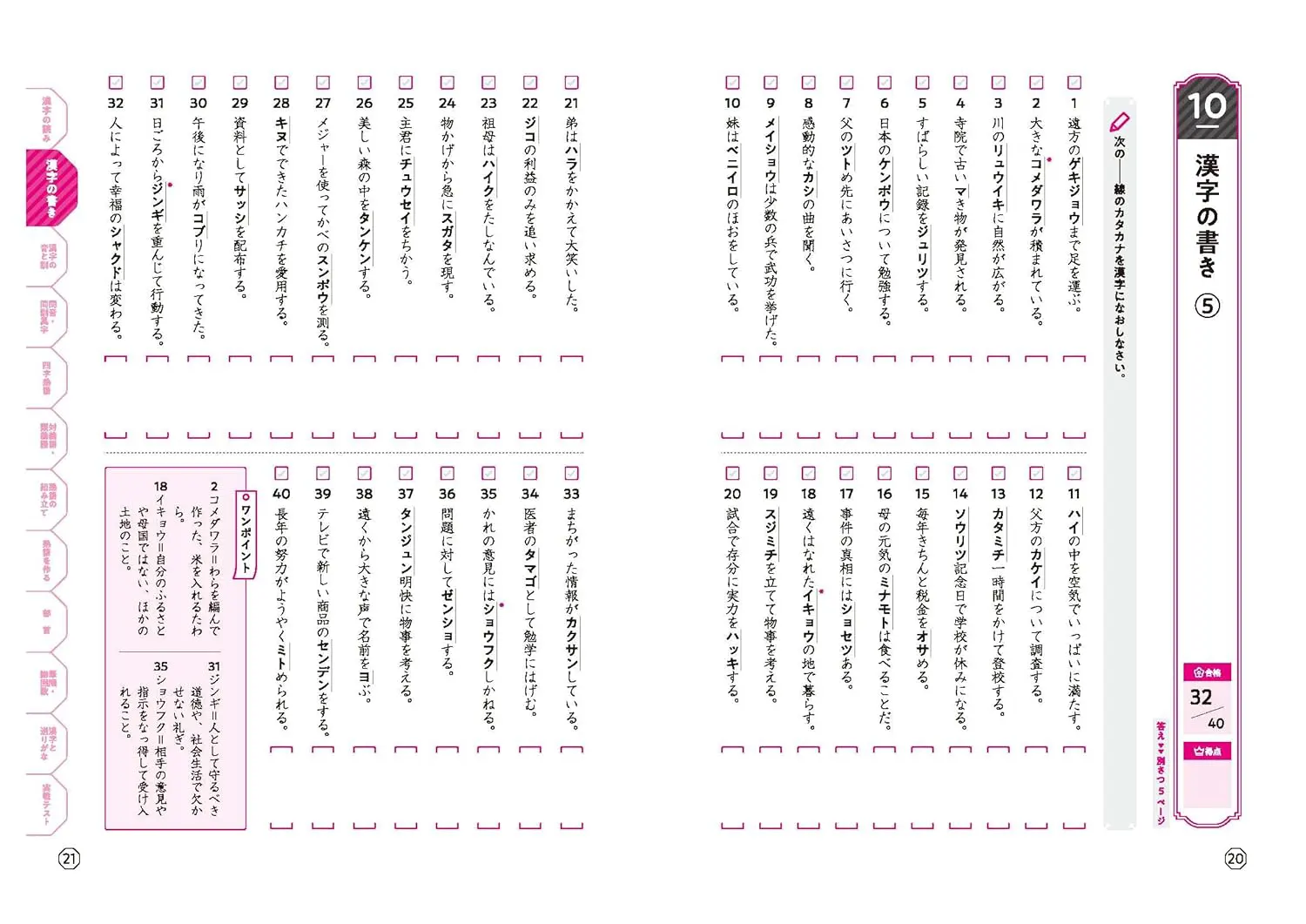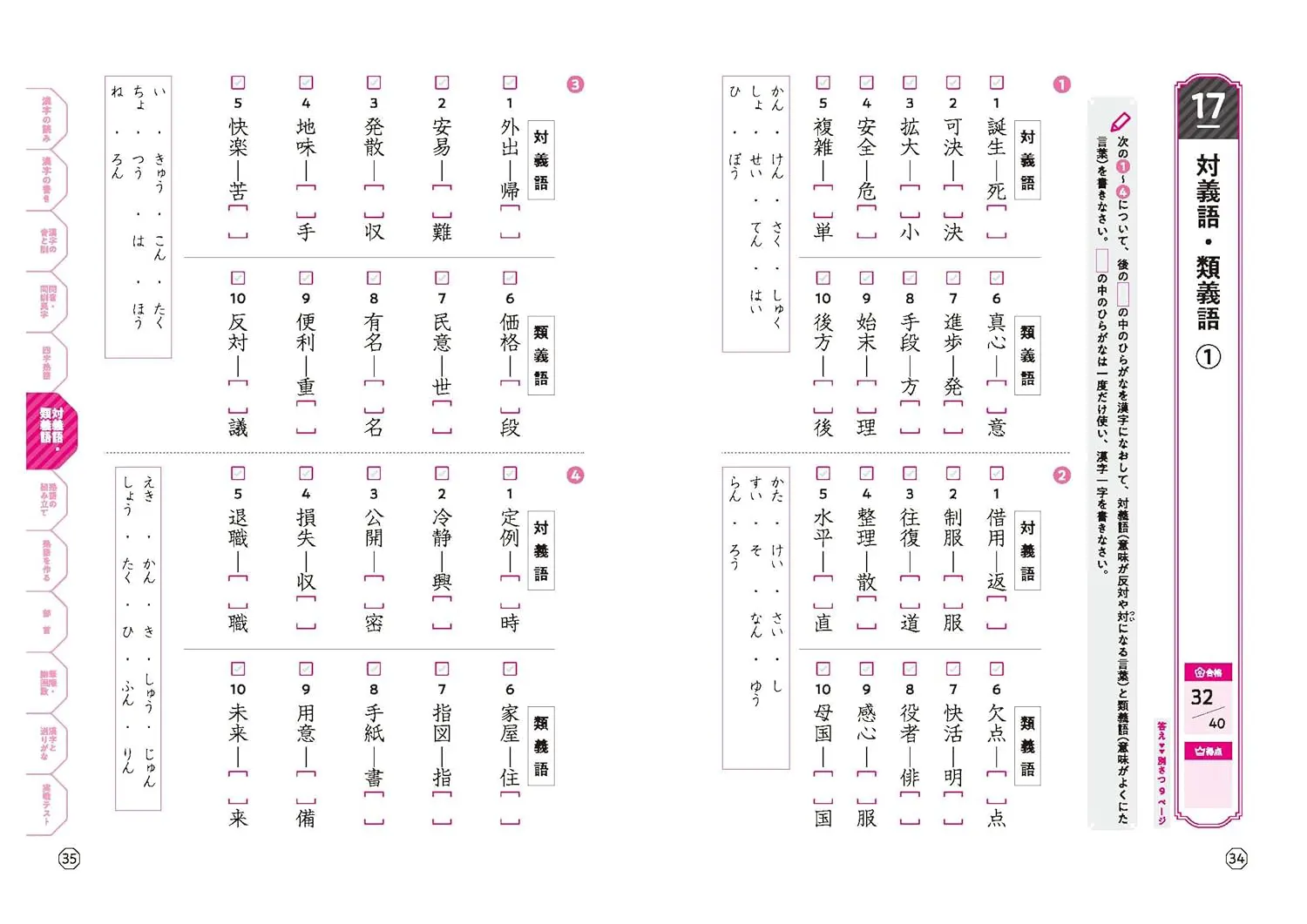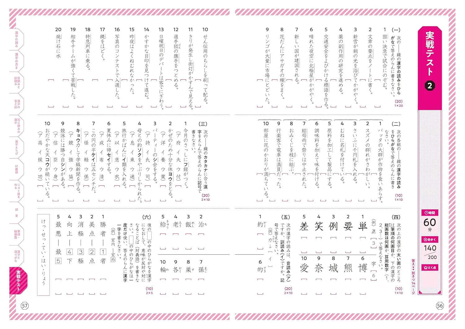 ・「漢字の読み」「漢字の書き」「同じ読みの漢字」「対義語」など、出題形式別なので漢検対策にぴったり。苦手分野対策にも使えます