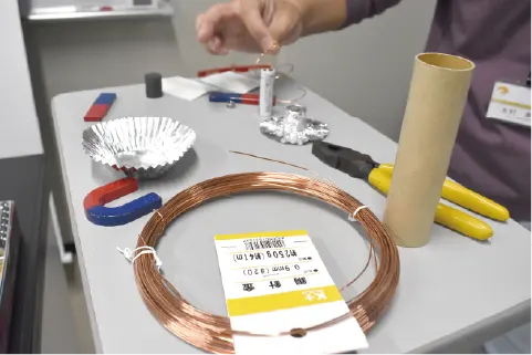 ▲すべて家庭で揃えることができる実験材料で、不思議な現象を再現します。「フレミングの法則」という言葉をはじめて耳にする子どもたちもいたことでしょう。