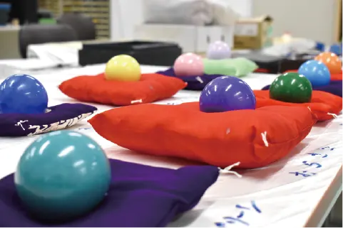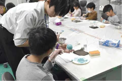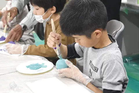 ペースト状の漆喰は絵の具と違い、水分が多すぎるとすぐに泥だんごに吸収されて着色しにくく、少なすぎると滑らかな球体になりません。みなさん真剣な様子で時間をかけて漆喰を塗り重ねていました。