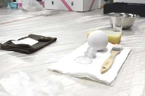 着色したペースト状の漆喰を塗り重ねることから始まる泥だんご作り。