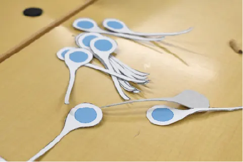 植物研究会のブースで松ぼっくりの標品を見せてもらったあと、お隣の向陽高校のブースに向かうと、松ぼっくりの種子と同じ構造をしている「カエデの種子」の模型を作るワークショップが開催されていました。