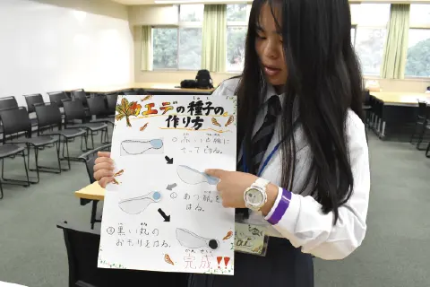 部員の皆さんに集まっていただいて、今回のワークショップの説明を聞くと、カエデの種子の構造からなぜそのような作りになっているのか、なぜそのような動きをするのかをていねいに説明してくれました。