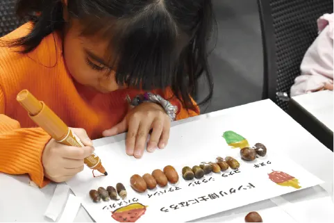 子どもたちはドングリが大好き!未就学の子どもたちは、ドングリでコマややじろべいの工作、小学生は特徴を書き込んだ標本をつくることができました。