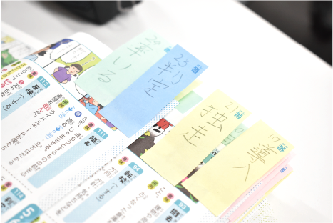ふせんに1、2、3、4、5...と番号をまず書いていきます。次に、『国語力を高めることば新辞典』や『自由自在 理科/社会』を開き、知っている言葉を見つけたら、ふせんにその言葉を書いて本に貼っていきます。